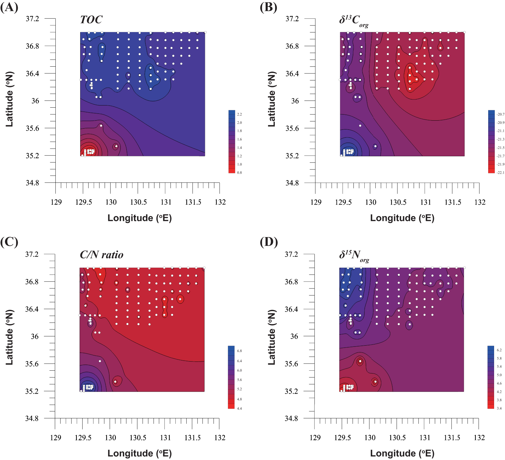 Spatial distribution maps of sedimentary and geochemical parameters in the East Sea: (A) TOC (wt%) shows higher concentrations in northern coastal areas and the central basin, with lower values near the straits. (B) δ¹³Corg (‰) displays more enriched values near the straits, with progressively more depleted values offshore. (C) C/N ratio highlights higher values in northern coastal areas compared to offshore regions. (D) δ15Norg (‰) exhibits the highest values near the straits and lower values in northern coastal and offshore areas.