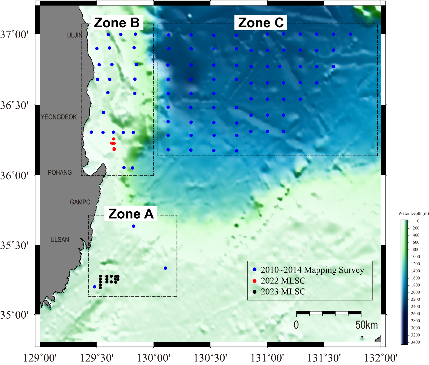 Spatial distribution of survey points across Zones A, B, and C in the southeastern offshore region of Korea. The zones are delineated to focus on specific areas of interest: Zone A (southern region), Zone B (central region near Yeongdeok and Pohang), and Zone C (offshore region to the east).