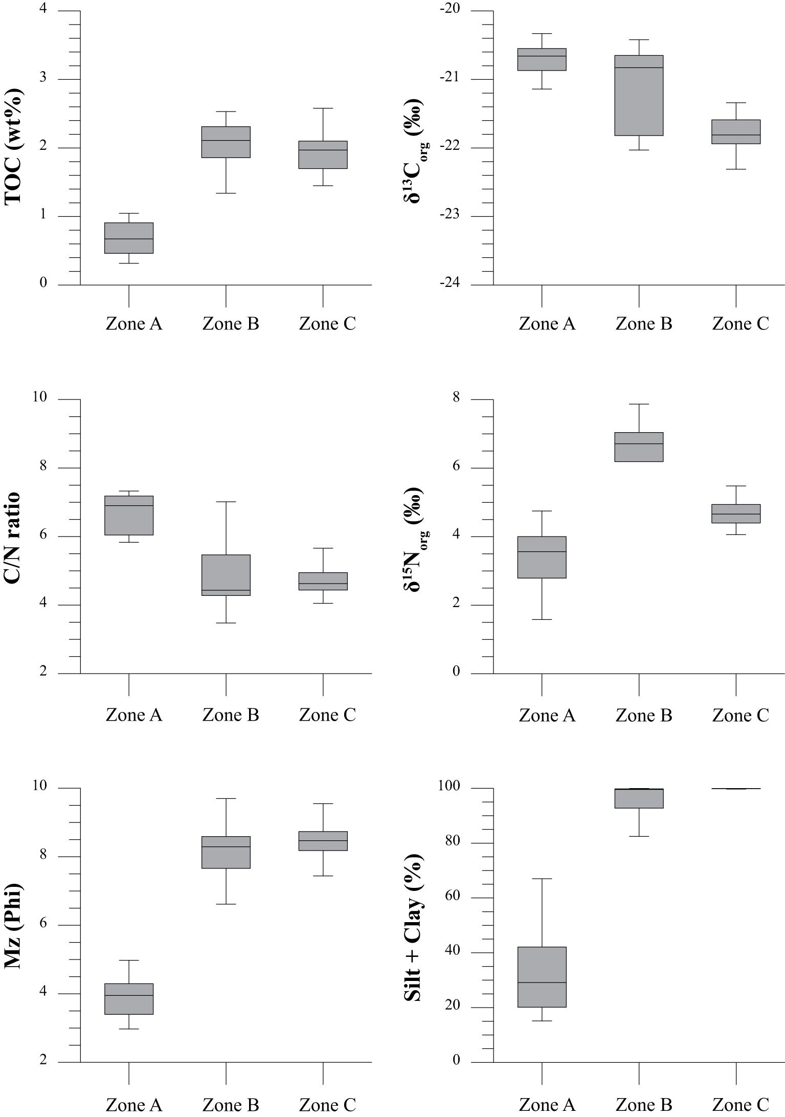 Boxplots depicting spatial variations of sedimentary and geochemical parameters across Zones A, B, and C.