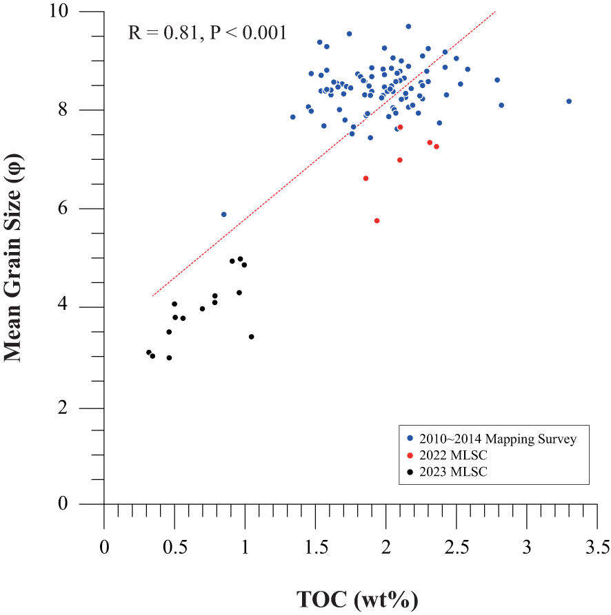 To better understand preservation efficiency, we considered multiple geochemical and sedimentological parameters in an integrated manner. While each parameter provides unique insight, their relative contributions were not explicitly weighted, as doing so was beyond the scope of this study. Pearson correlation analysis using all surface sediment samples showed a significant negative relationship between TOC and mean grain size (r = 0.81, p< 0.001), supporting the interpretation that finer sediments are more conducive to organic matter preservation (Figure 5). In addition to variations in organic geochemistry, sediment composition also exhibited a systematic spatial trend with respect to distance from the coastline. Coarser-grained sediments with lower mud content were observed in nearshore areas (Zones A and B), while fine-grained, mud-rich sediments dominated the offshore Ulleung Basin (Zone C). This trend reflects the decreasing influence of hydrodynamic energy and the increasing depositional stability toward deeper, offshore environments. This multi-indicator approach was intended to minimize interpretive uncertainty that may arise when relying on a single proxy. Beyond organic geochemistry, the spatial distribution of sediment texture also reflects underlying provenance and transport processes. In coastal regions (Zone B), relatively coarser sediments with lower mud content are observed, indicating stronger hydrodynamic conditions and influence from terrestrial inputs such as riverine discharge (e.g., Nakdong River). In contrast, the fine-grained sediments dominating the offshore Ulleung Basin (Zone C) suggest deposition primarily from suspended material delivered by lateral advection and settling from distant sources. These observations point to a continental-to-marine sediment delivery system, where hydrodynamic sorting and transport distance govern the sedimentary and geochemical characteristics across the shelf-to-basin gradient.
