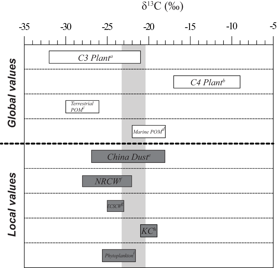 Studies on δ¹³Corg in marine sediments have primarily focused on identifying organic matter sources (e.g., Sackett and Thompson, 1963; Minoura et al., 1997) and examining variations in CO2 concentrations in surface water (e.g., Jasper and Hayes, 1990; Rau et al., 1992). Terrestrial plants primarily utilize atmospheric CO2 (δ¹³CCO2 ≈ −8‰) for photosynthesis, whereas marine phytoplankton rely on dissolved bicarbonate (δ¹³CHCO₃ ≈ +1‰) as their primary carbon source. Consequently, marine-derived organic matter exhibits δ¹³Corg values that are 6–7‰ higher than terrestrial-derived organic matter. In this study, these isotopic differences were used to distinguish terrestrial versus marine sources of organic matter. Although freshwater sediment samples were not directly analyzed, source identification was based on isotopic endmember values reported in previous studies. Additionally, the fractionation factor during photosynthesis for marine phytoplankton (ϵphyto-DIC) ranges from -36‰ to -22‰ (Wong and Sackett, 1978), influenced by factors such as CO2(aq) concentration (e.g., Degens et al., 1968; Rau et al., 1989; Hinga et al., 1994), growth rates and productivity (e.g., Laws et al., 1995; Popp et al., 1999), water temperature (e.g., Sackett et al., 1965; Mook et al., 1974; Wong and Sackett, 1978), and species composition (e.g., Descolas-Gros and Fortugne, 1985, 1990). Therefore, δ¹³Corg in marine sediments serves as an effective indicator of the relative contributions of terrestrial and marine organic matter to the depositional environment.