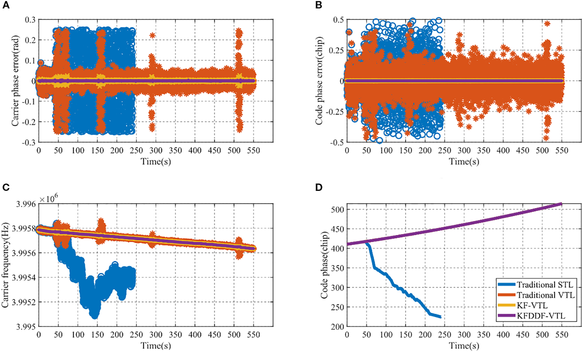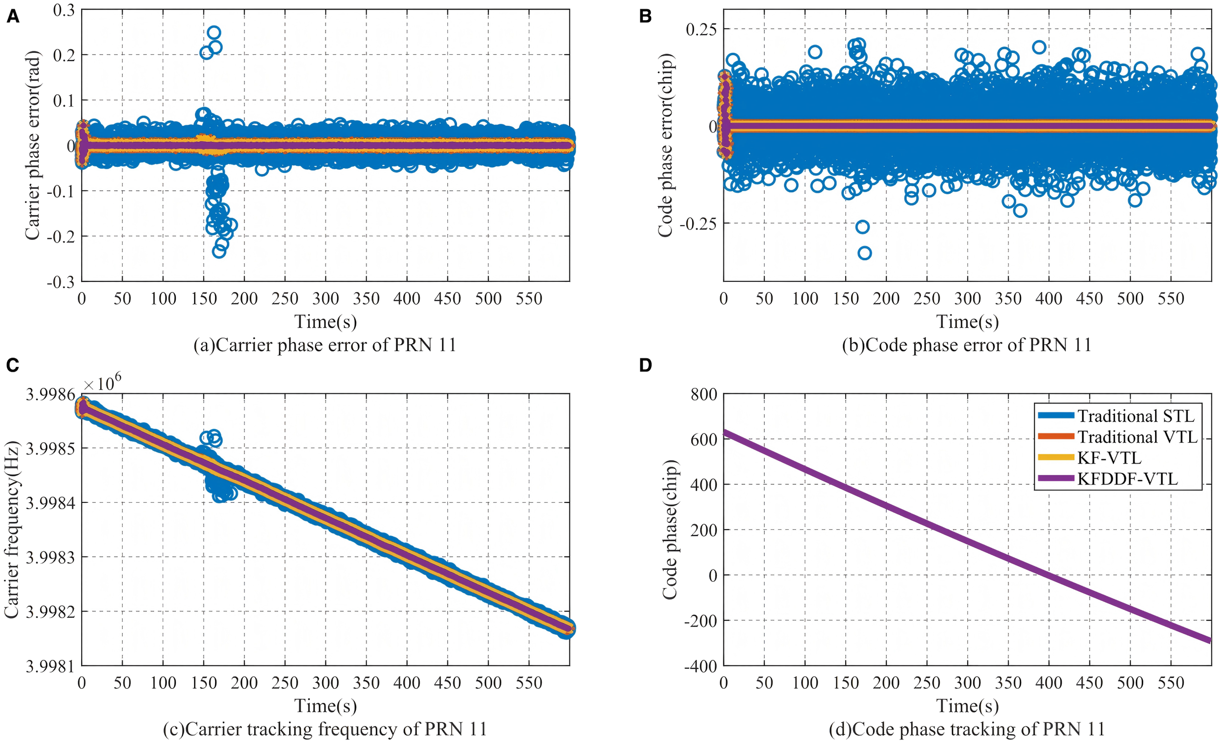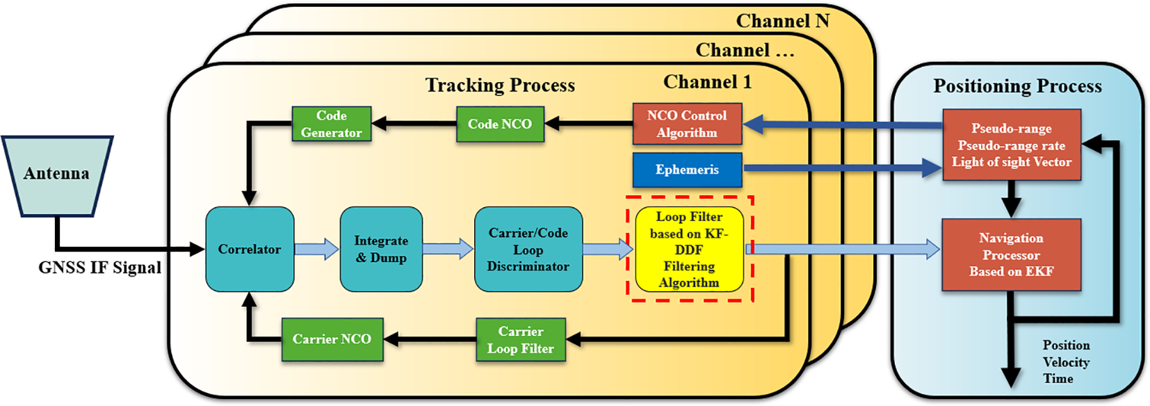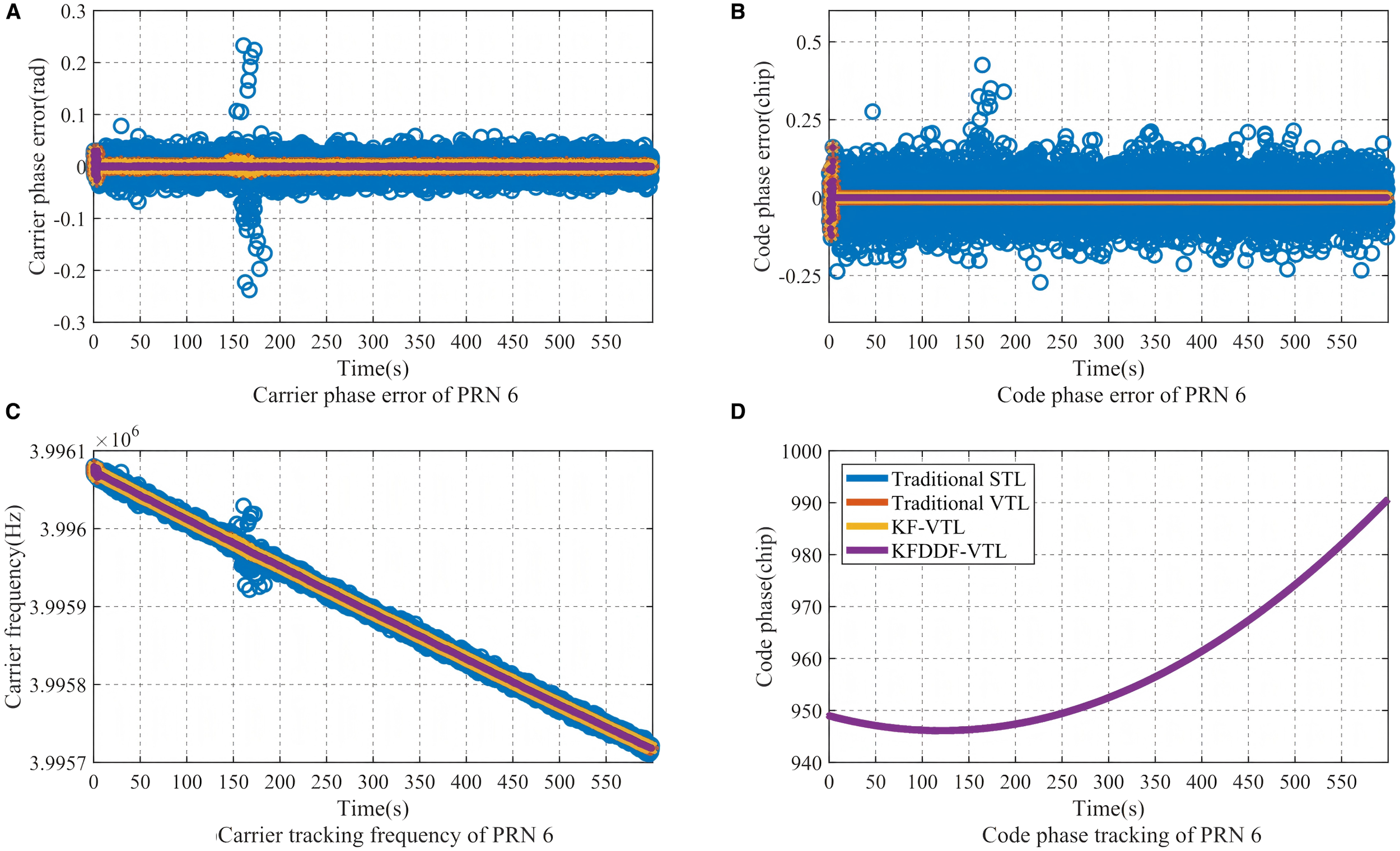 Satellite navigation receivers achieve a stable navigation output by continuously tracking radio frequency signals from navigation satellites. Based on the independence of signals within the tracking channels, signal-tracking loop methods can be categorized into scalar tracking loops (STL) and vector tracking loops (VTL). Scalar tracking is currently the most commonly used signal-tracking method for navigation receivers. The key feature is that the signal channels for each satellite operate independently without mutual interference. In environments with good signal quality and minimal interference, scalar tracking delivers an excellent signal-tracking performance. Additionally, owing to its low computational complexity and simple structure, scalar tracking is widely adopted in various types of navigation receivers (Gao et al., 2024). By contrast, the vector tracking method processes all satellite signals in a single integrative filter, thereby establishing interconnections among the satellite signals. It leverages the relationship between the satellite signal channels to estimate the navigation state. This estimated information can be used to predict the motion characteristics of the receiver. It can also be fed back into each signal-tracking channel to assist in the stable tracking of the signal loop (Sun et al., 2017). This approach enhances the stability and robustness of the vector tracking signal loop, enabling reliable signal channel tracking even in complex interference environments, thereby ensuring navigation accuracy (Zhao et al., 2011). Therefore, the vector tracking method has attracted widespread attention in the academic community. This is due to its excellent anti-interference capability and outstanding tracking performance under weak signal conditions.