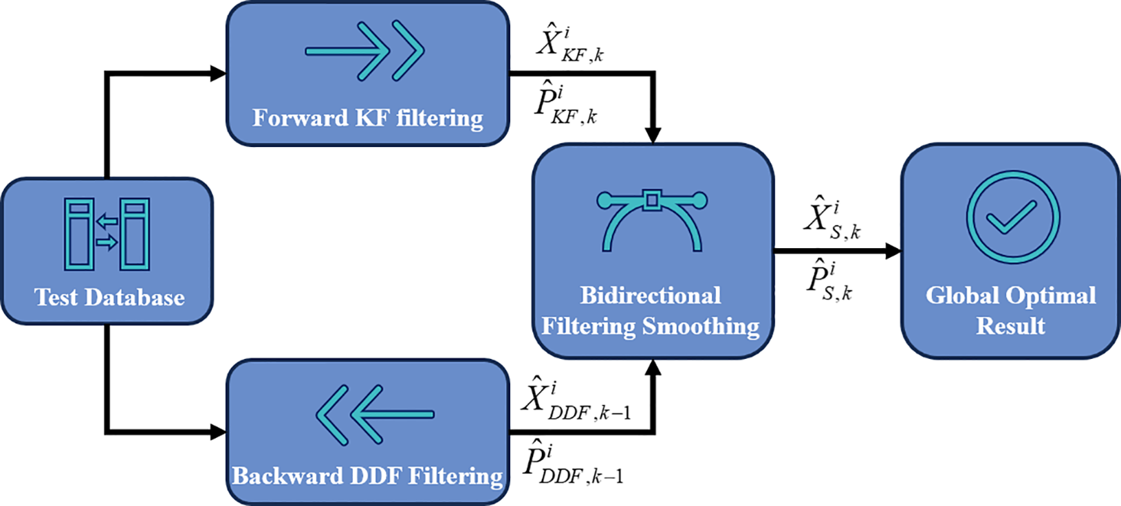 The mathematical model is as follows (Equations 35–37). The results of forward and backward filtering are jointly considered, and the global optimal estimates and are obtained through data fusion. The calculation formulae are as follows (Chen et al., 2021):