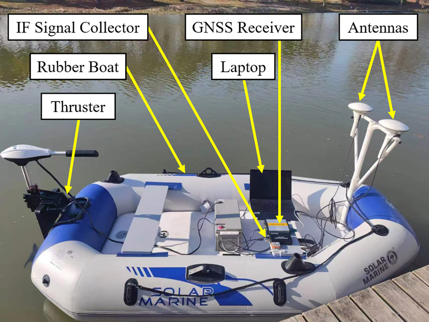 In the experiment, we selected a rubber boat as the platform to carry the experimental equipment, simulating the motion and operational scenarios of a shipborne platform under real-world conditions. The experimental equipment included a specialized receiver for collecting GPS intermediate frequency (IF) signals, high-precision navigation receiver module for real-time measurement and recording of positioning information, two full-band measurement antennas, and laptop for data storage and processing. This setup not only meets the requirements of the experiment for signal acquisition, but also provides comprehensive support for subsequent data analysis and processing, ensuring the reliability and accuracy of the experimental results. The performance parameters of the equipment are presented in the Table 1.
