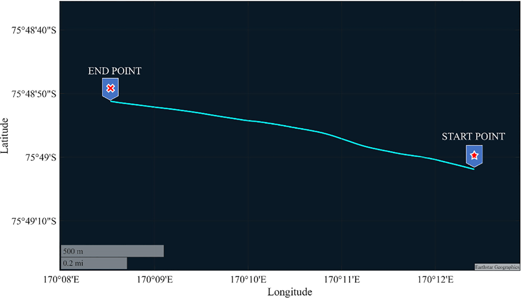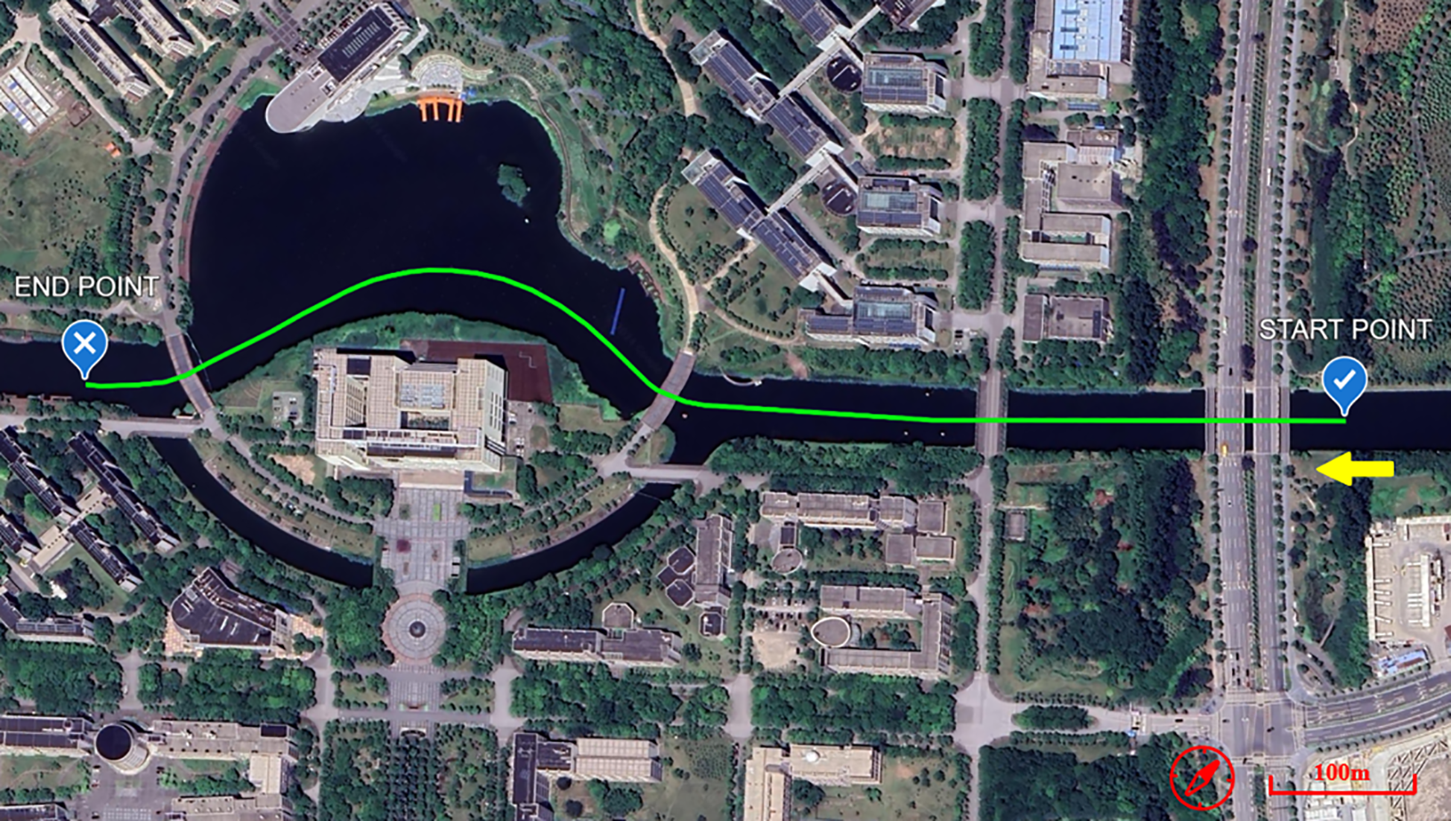 The total length of the experimental path was 900 meters. During the experiment, multiple bridges were crossed with widths of approximately 57.31 meters, 20.74 meters, 13.26 meters, and 12.65 meters, respectively. During the experimental phase, the rubber boat maintained a constant speed along the planned navigation trajectory. This setup was designed to continuously collect navigation data and to simulate the dynamic conditions of a shipborne platform during real-world operations. During the experiment, navigation data recorded by a high-precision Trimble BD-992 GNSS receiver was used as the reference trajectory. These data were compared with trajectories derived from different algorithms to evaluate the navigation accuracy and performance of each method. The entire experiment lasted for approximately 550 s.