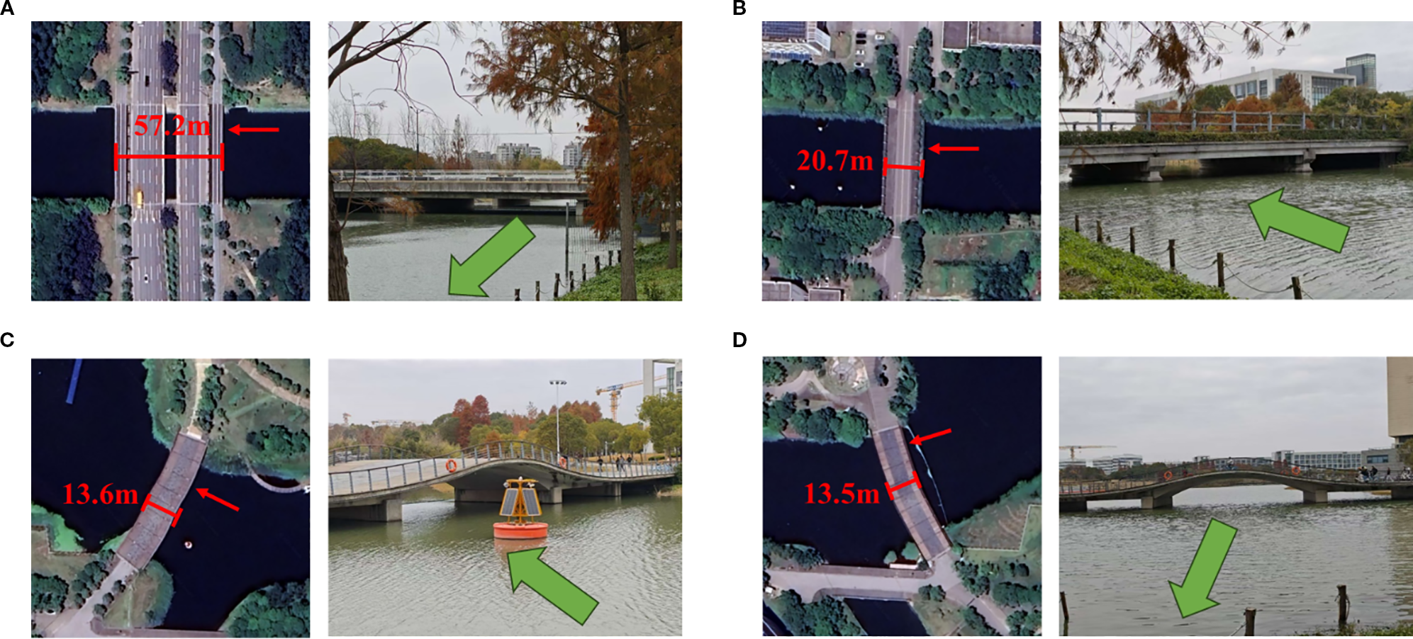In the experiment, we selected a river with a moderate width and a complex environment to simulate the operating status of ships in actual navigation. There are many bridges above the river in the experimental route. These bridges not only serve as a reproduction of the actual scene but also play the role of satellite signal obstructions in the experiment, which can effectively simulate the obstruction and multipath effects in the signal propagation path. By conducting experiments in such an environment, we can comprehensively test the navigation accuracy and robustness of different algorithm systems in complex environments. In addition, the experiment simulated the changes in signal quality under different degrees of obstruction by blocking the signal with bridges of different widths to evaluate the adaptability and performance of each system under harsh signal conditions, thereby providing valuable reference data for practical applications. The experimental trajectory is shown in Figure 4. Specific scenarios of bridge obstructions are shown in Figures 5A-D.