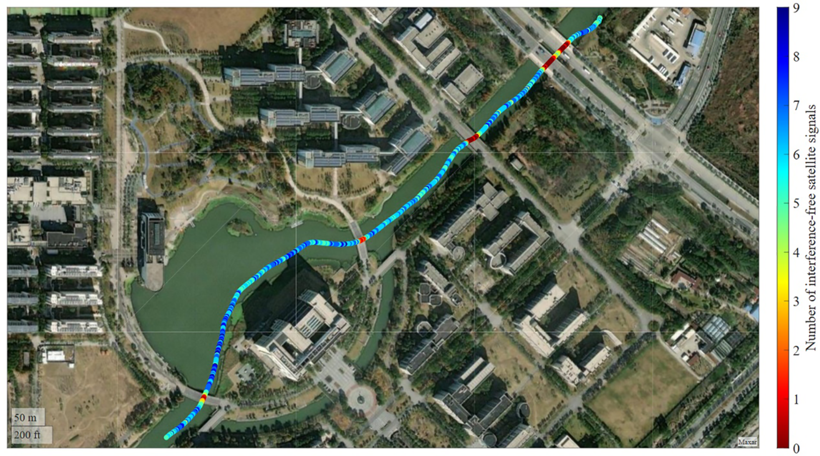 The number of interference-free satellite signals recorded during the experiment is shown in Figure 6. This figure illustrates the variation in the number of satellites captured by the receiver at different time points, allowing for intuitive observation of how signal occlusion and multipath effects impact satellite visibility and navigation accuracy. When there is a bridge obstruction, the number of interference-free satellite signals drops sharply, which leads to a rapid decrease in the accuracy of the navigation system, thereby affecting the reliability of the system.