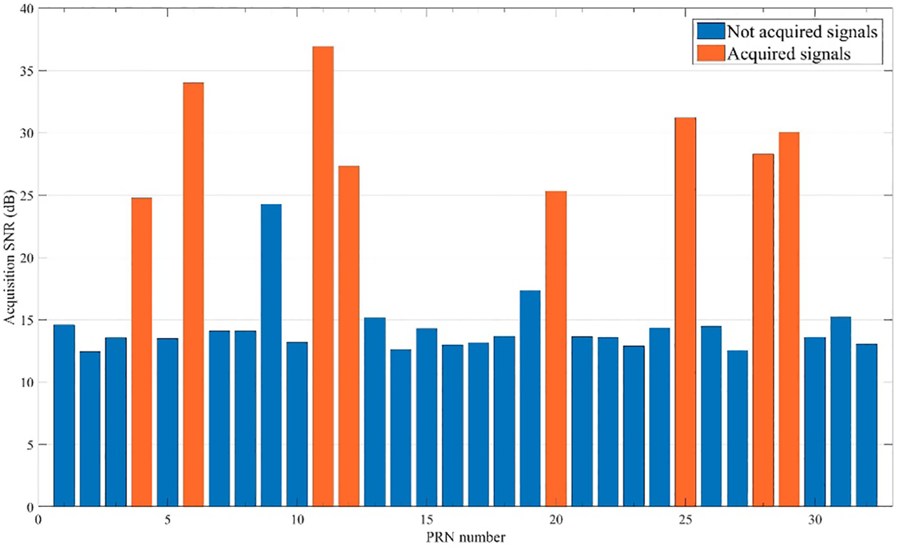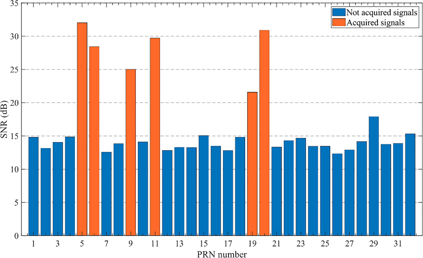 In the initial stage of the experiment, six GPS satellites were successfully acquired based on the elevation angle and signal-to-noise ratio conditions, which served as the basis for the subsequent signal-loop tracking process. The satellite acquisition results are shown in Figure 7.