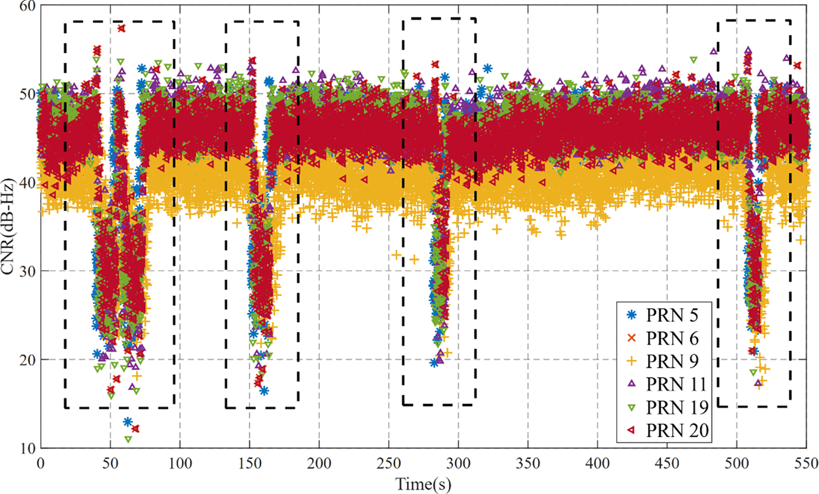 As shown in Figure 8, it is evident that when the rubber boat passes under bridges with signal obstruction, the CNR of the satellite signals quickly drop below to 30 dB-Hz. This indicates that the signal quality received by the receiver deteriorates significantly owing to the severe obstruction. Under such conditions, the navigation system may face difficulties in tracking and may even risk losing the signal.