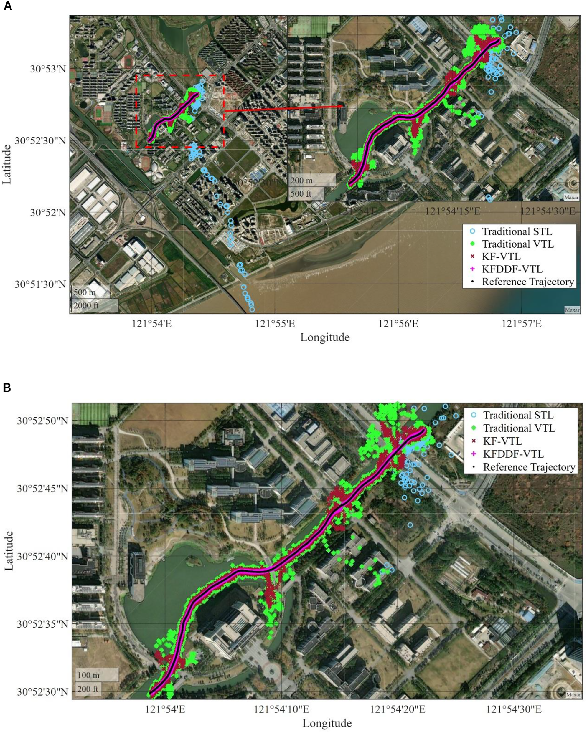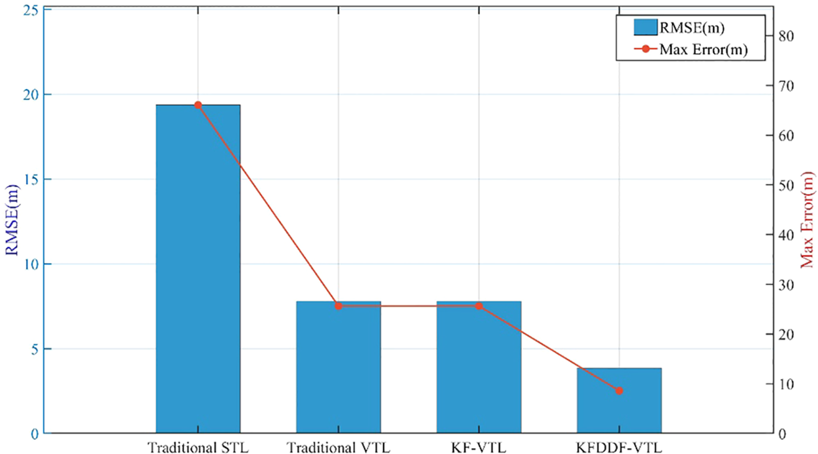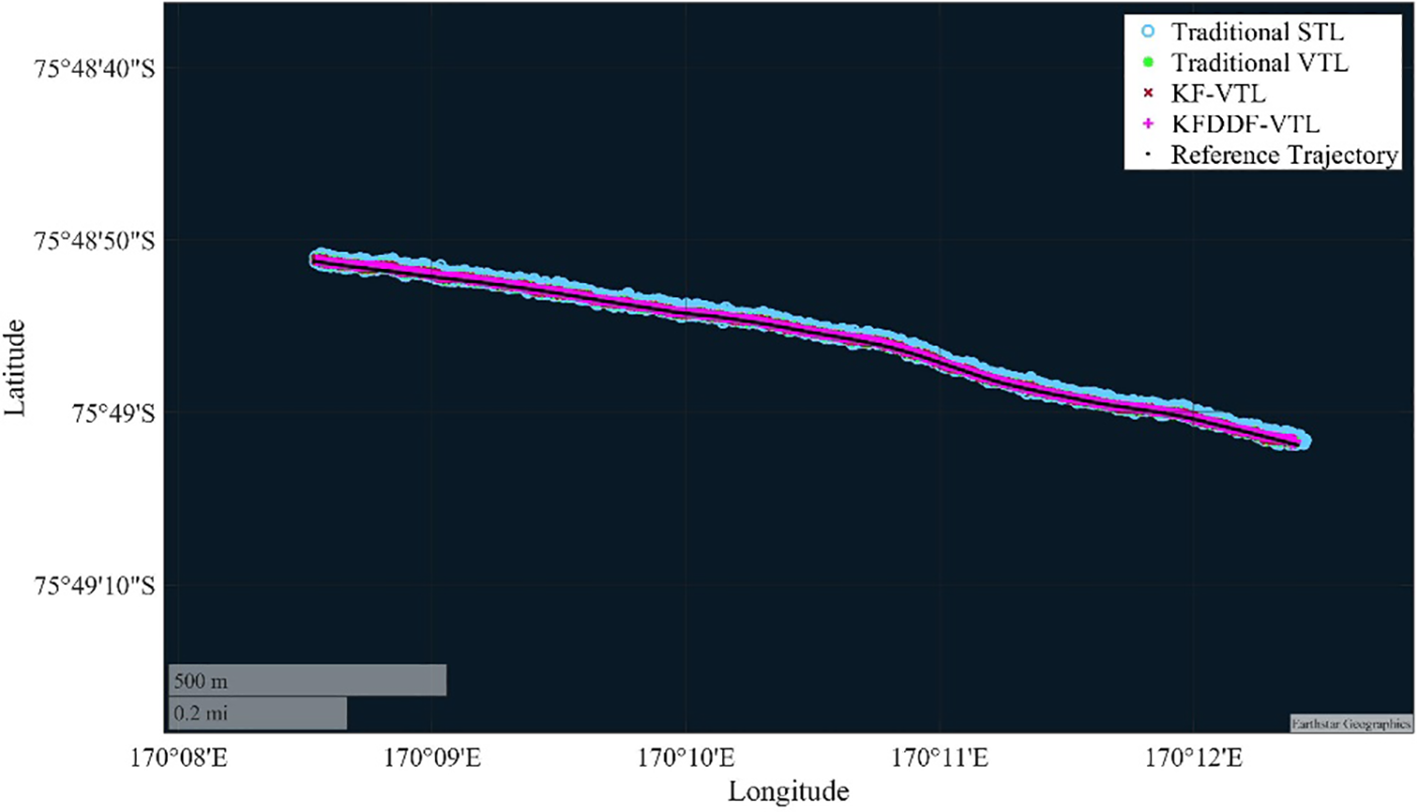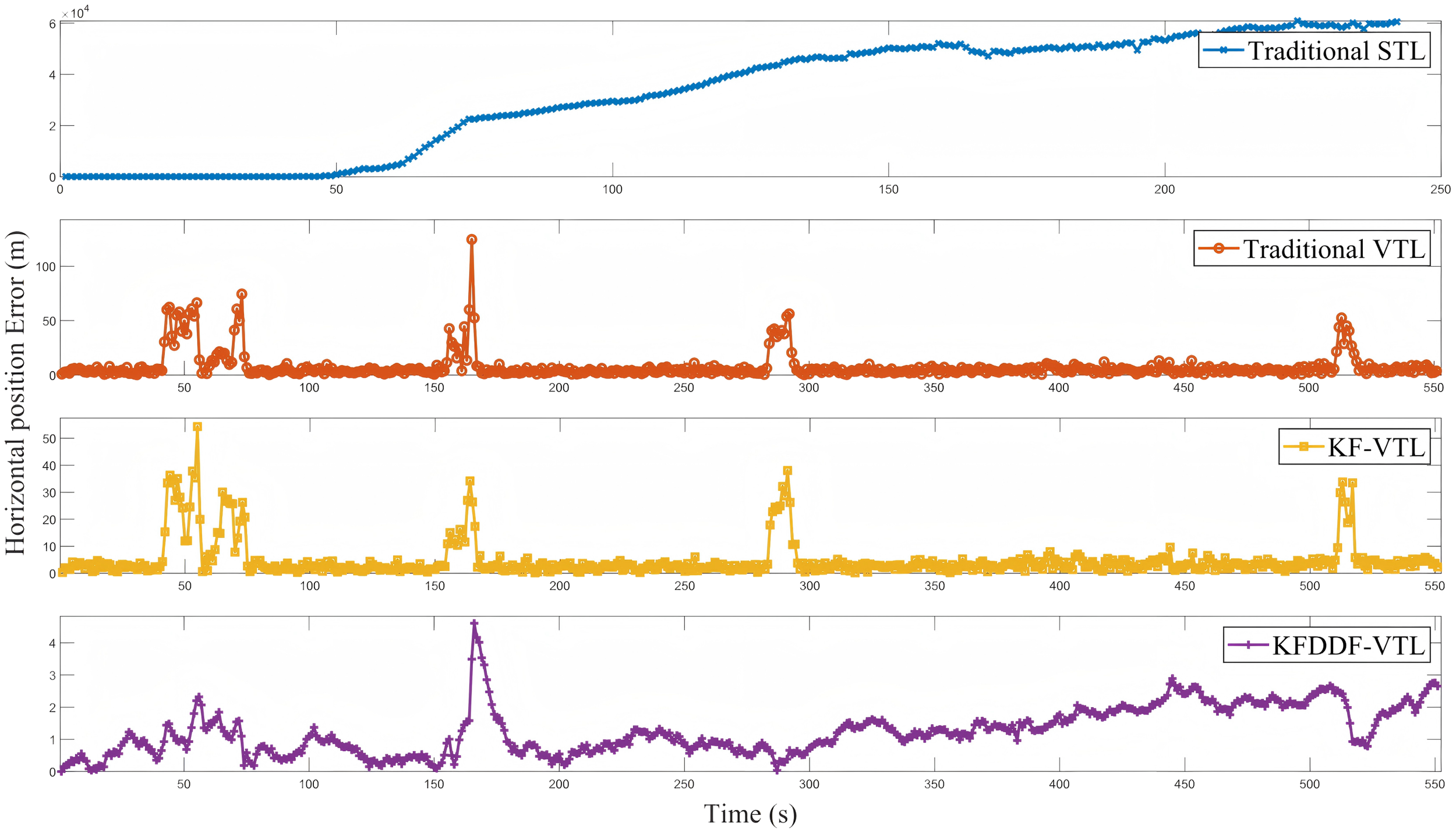 The shipborne experimental navigation and positioning results are shown in Figure 10. In this experiment, the high-precision GNSS navigation receiver Trimble BD992 was used to generate the reference trajectory, which is represented by the black line in the figure. To evaluate the positioning performance of different methods comprehensively, the experiment compared the results of the traditional STL, traditional VTL, Kalman Filter based VTL method (KF-VTL), and KF-DDF-based VTL method proposed in this study. From the figure, it can be intuitively observed that the performance of the different methods in terms of navigation accuracy shows significant differences. The traditional STL and VTL methods are easily affected by signal interference and blockages in complex environments, resulting in deviations and accuracy divergence in the positioning results. In particular, the traditional STL method experienced signal loss during the experiment, resulting in an inability to provide positioning results. Although the KF-based VTL method improves performance, it still shows a noticeable drop in accuracy under signal blockage conditions. In contrast, the KF-DDF-based VTL method proposed in this study demonstrated significant advantages by consistently providing stable and high-accuracy navigation and positioning results throughout the experiment, effectively overcoming the negative impacts caused by signal interference and blockage.