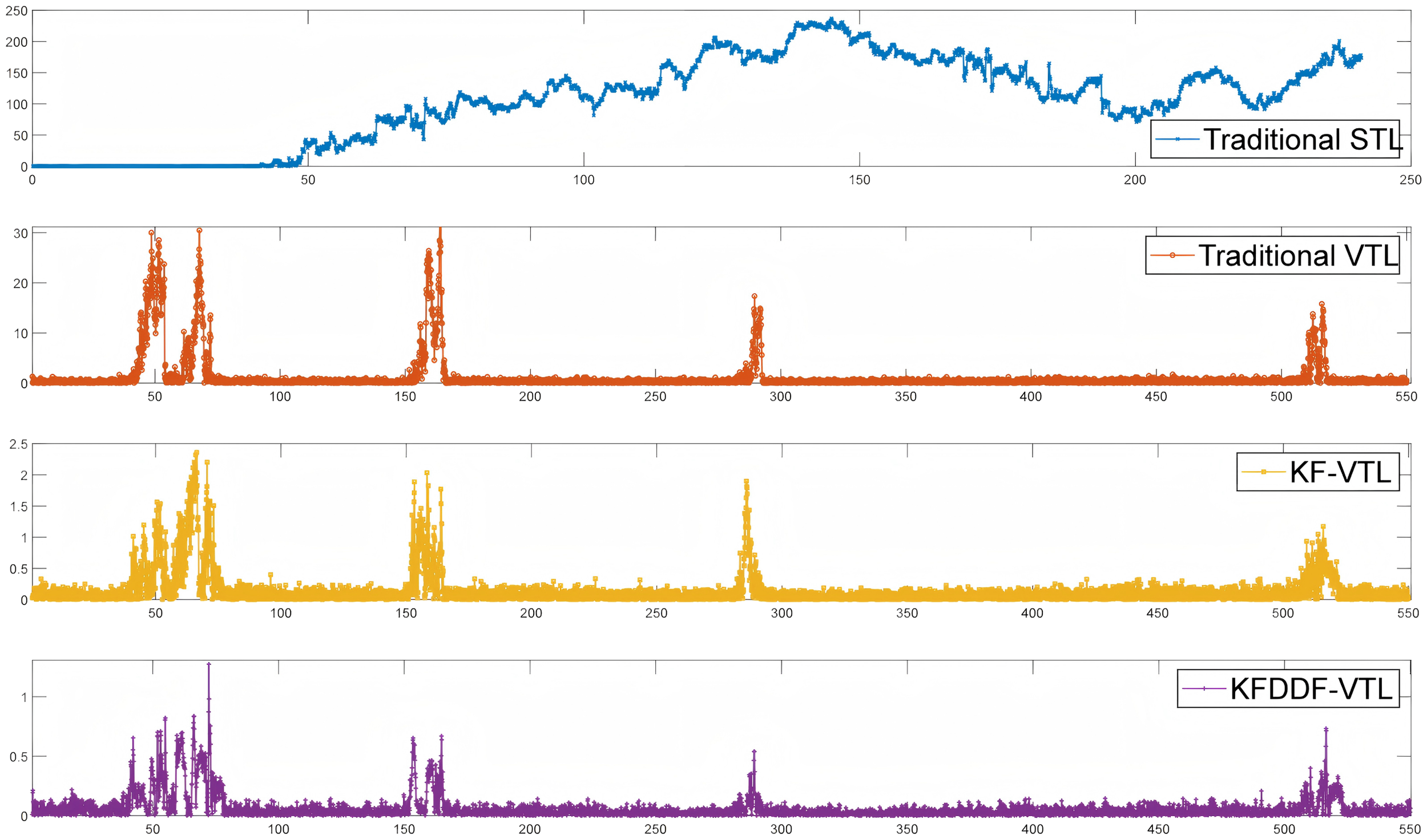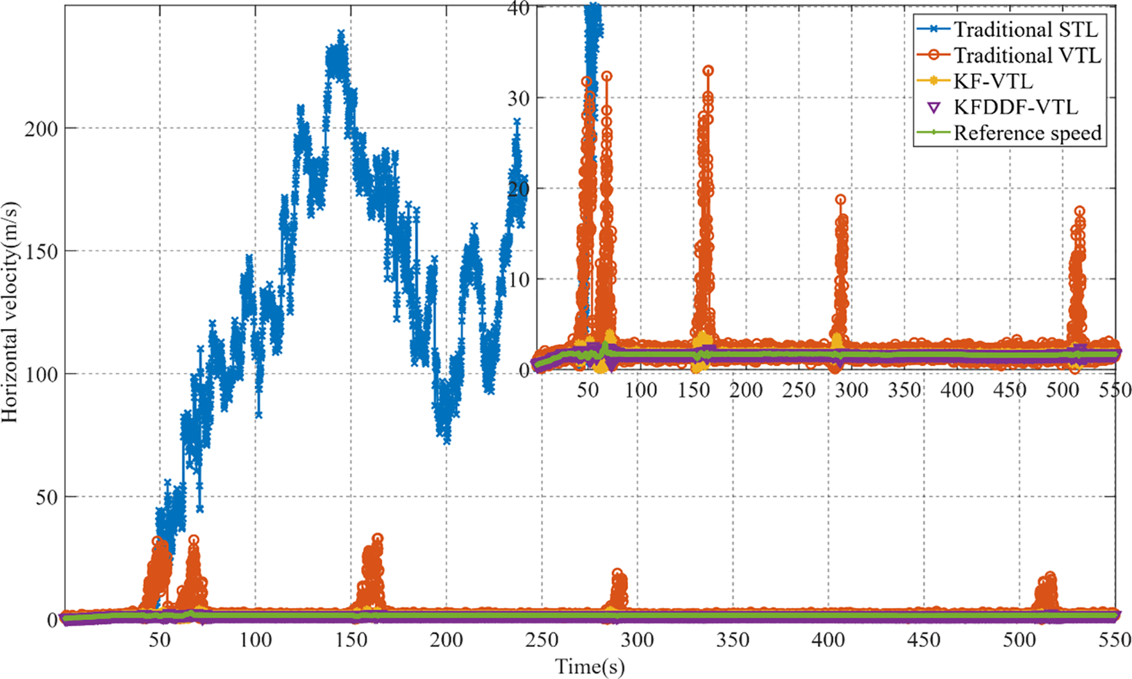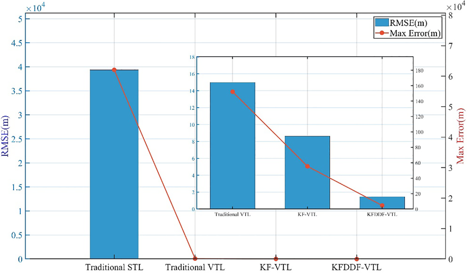 The shipborne experimental navigation and positioning results are shown in Figure 10. In this experiment, the high-precision GNSS navigation receiver Trimble BD992 was used to generate the reference trajectory, which is represented by the black line in the figure. To evaluate the positioning performance of different methods comprehensively, the experiment compared the results of the traditional STL, traditional VTL, Kalman Filter based VTL method (KF-VTL), and KF-DDF-based VTL method proposed in this study. From the figure, it can be intuitively observed that the performance of the different methods in terms of navigation accuracy shows significant differences. The traditional STL and VTL methods are easily affected by signal interference and blockages in complex environments, resulting in deviations and accuracy divergence in the positioning results. In particular, the traditional STL method experienced signal loss during the experiment, resulting in an inability to provide positioning results. Although the KF-based VTL method improves performance, it still shows a noticeable drop in accuracy under signal blockage conditions. In contrast, the KF-DDF-based VTL method proposed in this study demonstrated significant advantages by consistently providing stable and high-accuracy navigation and positioning results throughout the experiment, effectively overcoming the negative impacts caused by signal interference and blockage.