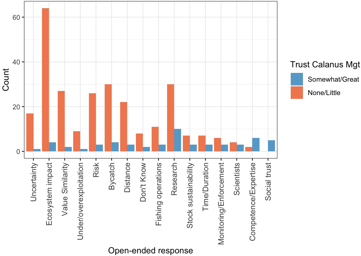 Most common codes mentioned in responses to the follow-up item asking respondents to explain their trust or lack of trust in Calanus management (‘Why? What contributes to that level of trust?’). Responses are disaggregated by those who report higher trust in management (replying ‘somewhat’ or ‘a great deal’ in response to ‘How much do you trust current management of the Calanus fishery’) and those who report lower trust (responding ‘not very much’ or ‘not at all’).