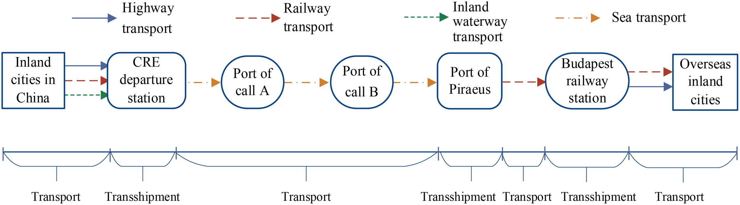 Ever since President Xi of China proposed the “One Belt, One Road” Initiative in 2013, the mutual trade between China and Europe has experienced enormous development. According to related statistics (Eurostat, 2024), at the beginning of the proposal in 2013, the two-way trade value between China and the European Union (EU) is 559.01 billion dollars, while that value has reached 740.00 billion dollars in 2023, rising by 32.36%. Therein, the export trade value from China to Europe is 712.27 billion dollars, which is 21.07% of the total export value; the import value from Europe to China is 498.30 billion dollars, which is 19.49% of the total import value (National Bureau of Statistics of China, 2024). As global climate change continues to pose a serious threat, countries around the world are working collaboratively to address the issue of carbon emissions (Xu et al., 2024a). The shipping sector accounts for approximately 3% of global greenhouse gas emissions. While its share is relatively small, its long-term environmental impact cannot be overlooked (Xiao et al., 2025). Reducing carbon emissions has become a central task for nations striving to achieve sustainable development (Xin-gang et al., 2023; Xu et al., 2024b). Shipping companies should step up investment in research and development for carbon emission reduction technologies from a long-term perspective (Xiao and Cui, 2023). The growing demand for trade has created an urgent need for transportation modes that are cost-effective, low-emission, and highly efficient. Container transportation has gradually become a main transportation mode in the China–Europe network. At present, there are three main container transportation corridors between China and Europe. They are (1) the sea transportation corridor; (2) the railway transportation corridor mainly based on the China Railway Express (CRE); and (3) the sea–land express transportation passage via Piraeus mainly based on sea and railway transportation. The operation process based on these three main corridors is shown in Figures 1–3. Each of the transport corridor has its own advantages and disadvantages, while complementing each other (Yang et al., 2018).