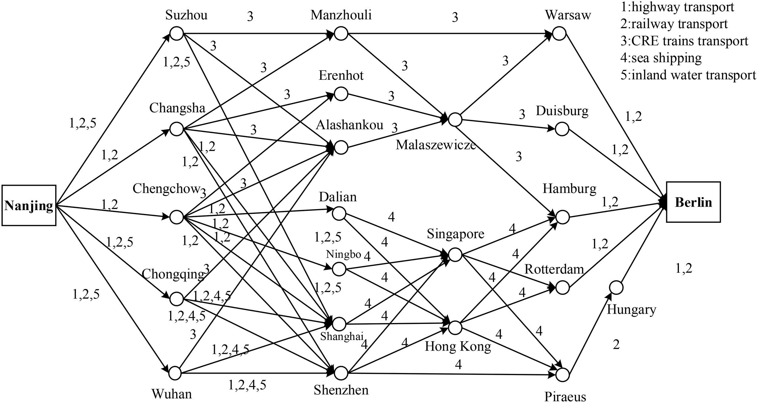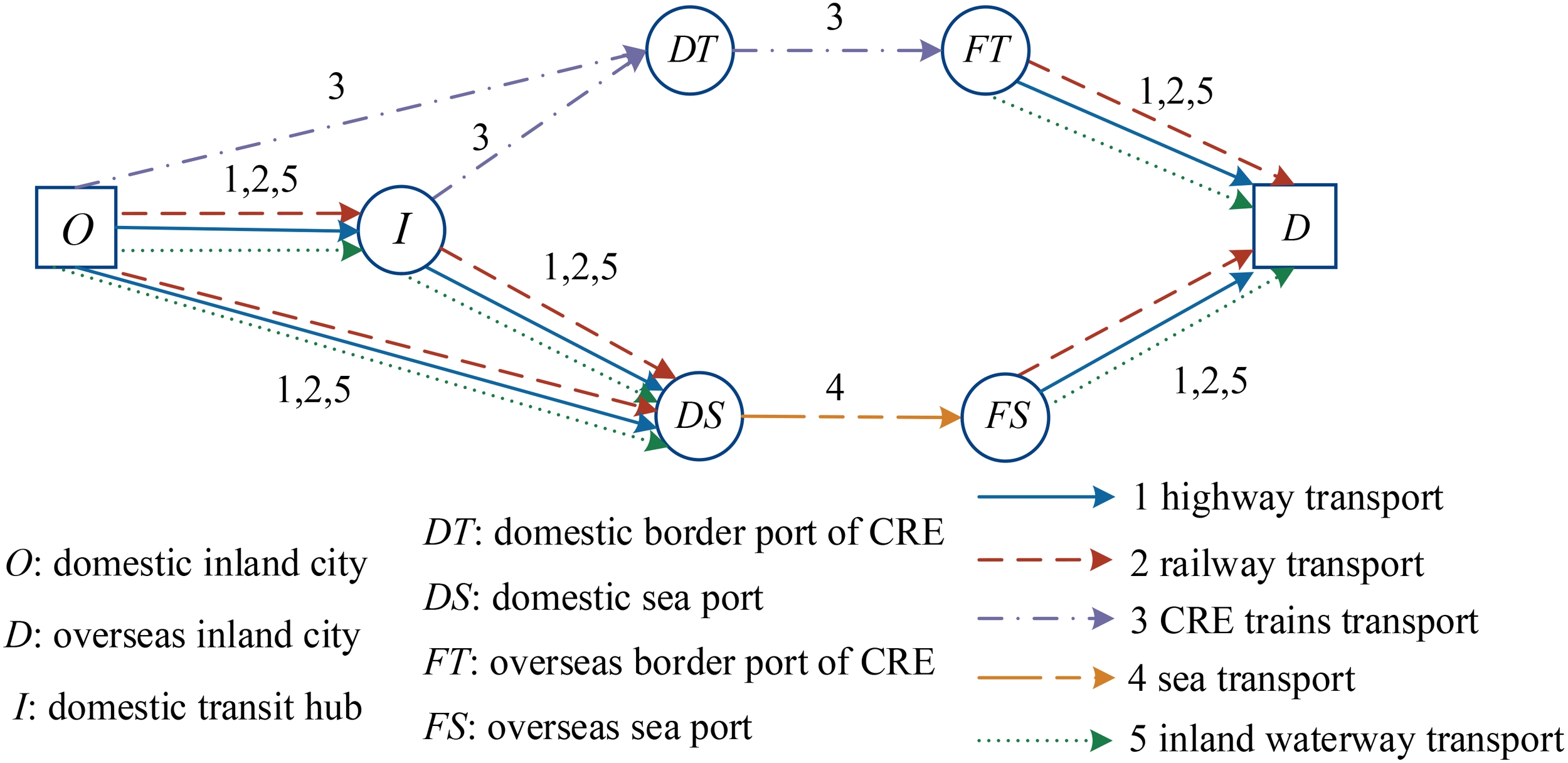 . The value from 1 to 5 represents highway, railway, CRE trains, sea, and inland waterway transport, respectively, ;