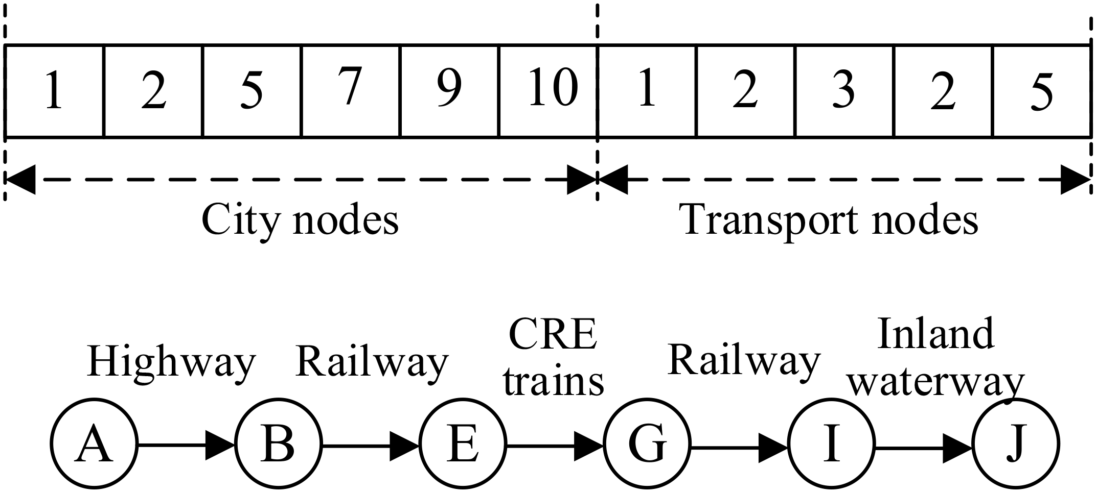 In recent years, research on multimodal transportation route optimization has been continually advancing. Qi (2024) developed a multi-objective route optimization model for rural cold chain logistics in multi-temperature zones, balancing transportation costs, carbon emissions, refrigeration energy consumption, and service quality, making it suitable for small-scale fresh goods. Yang et al. (2024) addressed differences in cargo time sensitivity by introducing mixed time window constraints and designed a bi-level genetic algorithm to optimize container transportation routes, enhancing the model’s adaptability to heterogeneous cargo demands. Huang et al. (2025) developed a multi-objective model considering both transportation costs and time based on Shanghai Port and its hinterland, optimizing the hinterland port access routes using an improved particle swarm algorithm. Ma et al. (2023b) adopted uncertain programming methods to address cross-border transportation under uncertain demand, incorporating factors such as carbon taxes, customs fees, and inland port location selection, and designed a cross-border multimodal transport network model.