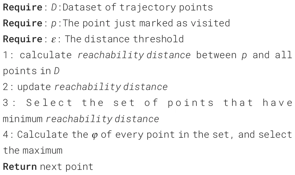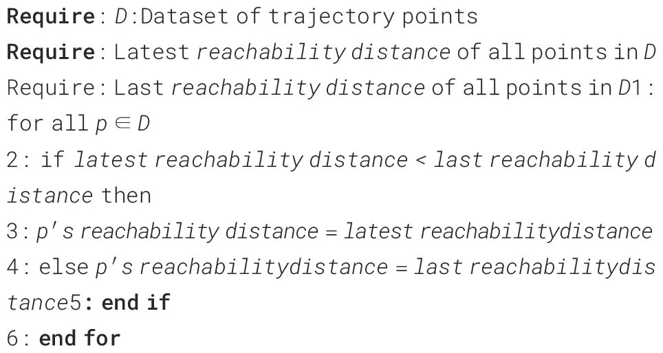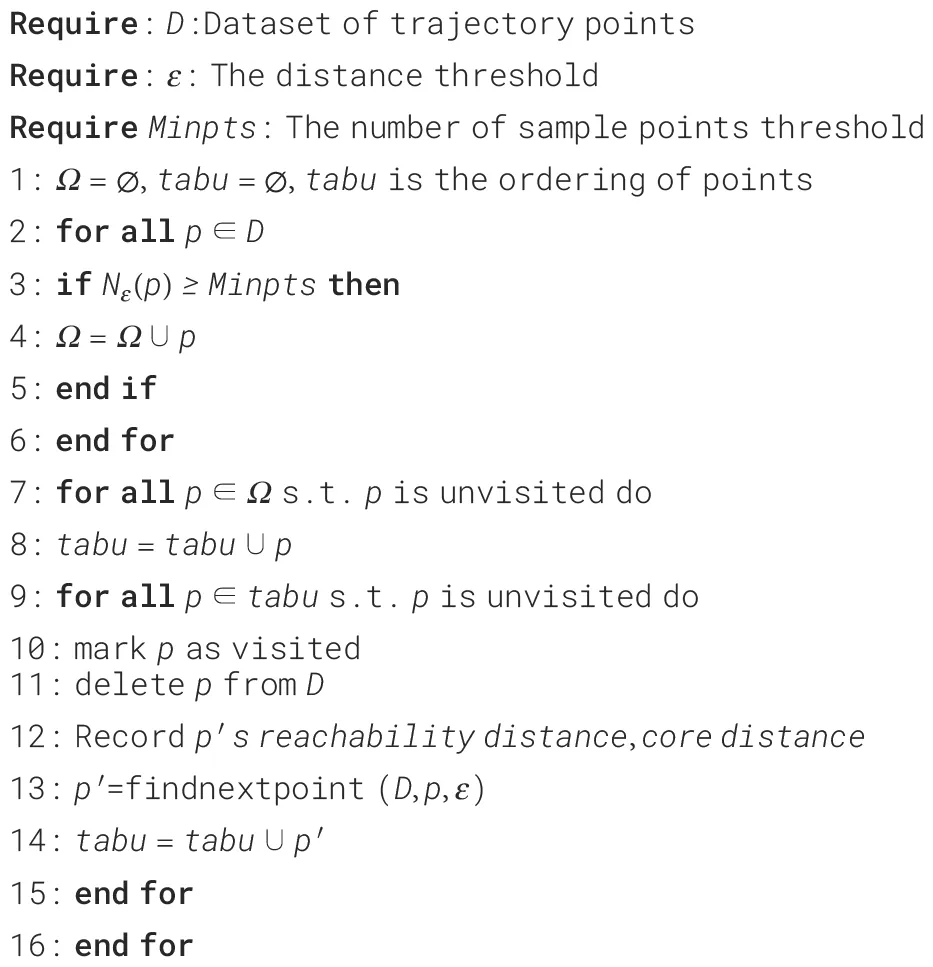 DF-OPTICS algorithm has the same definitions as the traditional OPTICS algorithm. According to the DF theory, if multiple data objects exist in the data field space with no external force, the data objects will move in opposite directions due to their interactions. The DF potential function is used to react to the size of the interaction force between the data objects in the data field space. A higher value indicates a more significant interaction force from the surrounding trajectory points, indicating a denser concentration of these points. An improved OPTICS algorithm that integrates the DF theory and the DF-OPTICS algorithm is proposed.
