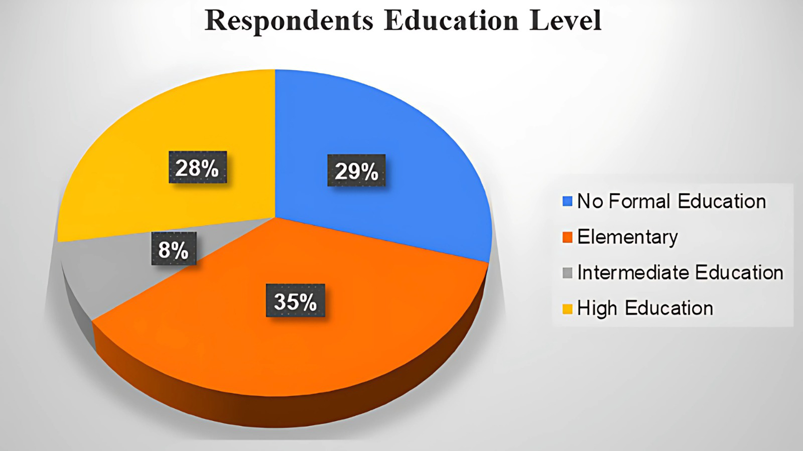 In terms of educational level, Figure 3 shows that the majority of respondents had completed elementary school or had no formal education, accounting for 64% of the sample population. The results also showed that only 8% had completed higher education.
