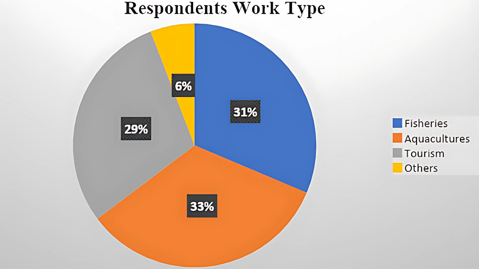 Based on occupation (Figure 4), the majority of respondents were engaged in the aquaculture sector, specifically as crab and green mussel fishermen, as well as pond managers (35%). Fishermen primarily operated in coastal and offshore areas for the activities. Furthermore, 31% of respondents worked in the fish capturing sector, including net and dive fishermen. Approximately 29% were in the tourism sector, particularly as dive tour guides, whereas 6% were in other related service sectors, such as fish processors and ice sellers for fishing vessels.