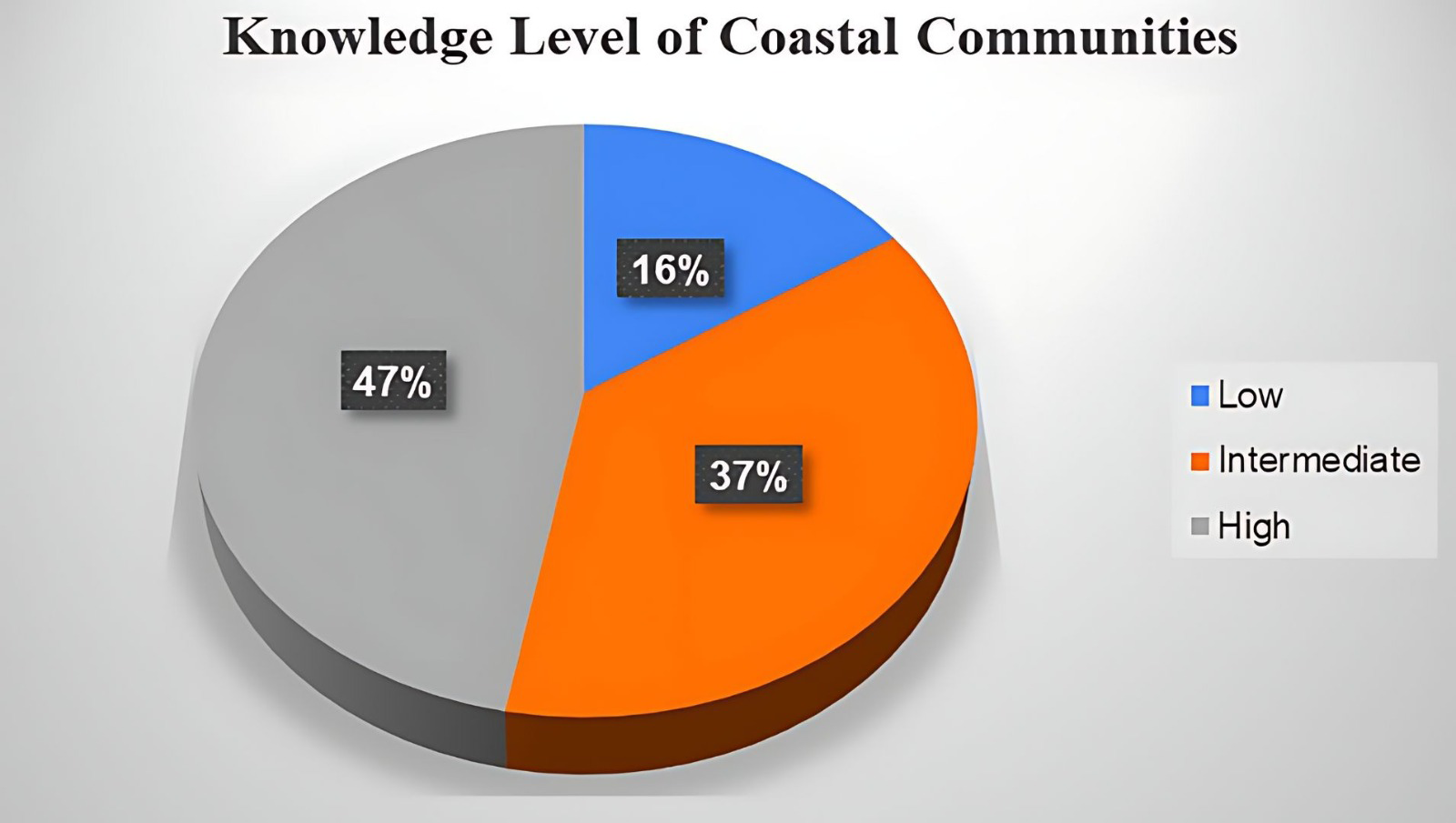 Coastal community knowledge of coral reef ecosystems is divided into three classes. Low levels of knowledge community (total score 3-5) mean they do not know the function and benefits of coral reef ecosystems in the sustainability of the coastal environment, do not have knowledge that the decline in coral reef populations can affect the sustainability of the coastal environment, and do not know how to preserve the existence of coral reef ecosystems. Intermediate levels of knowledge community (total score 6-7) mean that although they know the function and benefits of coral reef ecosystems in the sustainability of the coastal environment, they do not know how to preserve coral reef ecosystems. Community classes with high levels of knowledge (total score 8-9) know the function and benefits of coral reef ecosystems in sustaining the coastal environment, are aware that the decline in coral reef populations could affect sustainability of the coastal environment, and know how to preserve coral reef ecosystems.