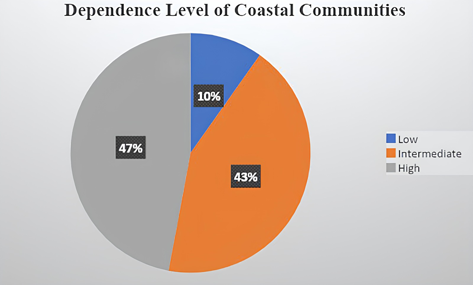Descriptive statistical analysis using the coefficient of contingency showed a high dependence level among respondents in the aquaculture fishermen group and the tourism sector workers. Meanwhile, in terms of education level, higher levels were predominantly observed among those without formal education. Based on location, the majority of respondents with medium and high dependence were situated in coastal areas.