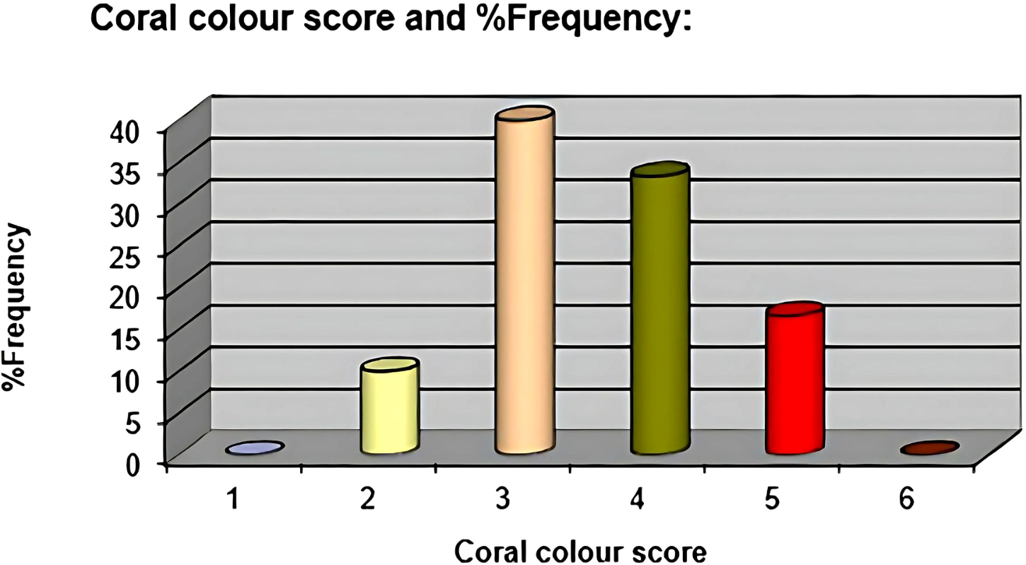 Following training on management using the GIS application and Coral Health Chart, respondents were asked to observe and measure coral reef (Sharifan, 2020). The collected data were categorized based on coral color and subsequently summarized, as shown in Figure 11. The data presented included the frequency (in percentage) and color score. Frequency represented the number of observed corals during the assessment, whereas the score showed the color level. Healthy corals were denoted by a score above 3 (medium–high), but stressed or bleached variants were shown by a score of 1 to 2 (low). Based on the data collected by the training respondents, the condition of coral reef in the waters was categorized as medium to high, which is good, as signified by a score of 3 to 5.