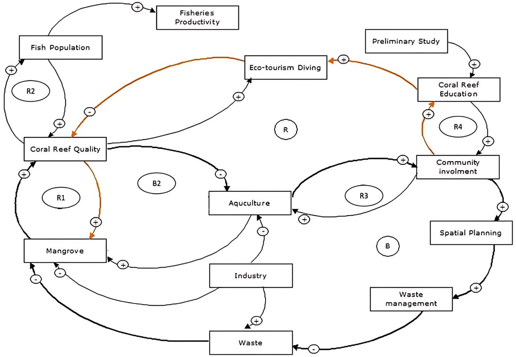 Causal loop diagram (CLD) model for the sustainability of coral reef ecosystem management.