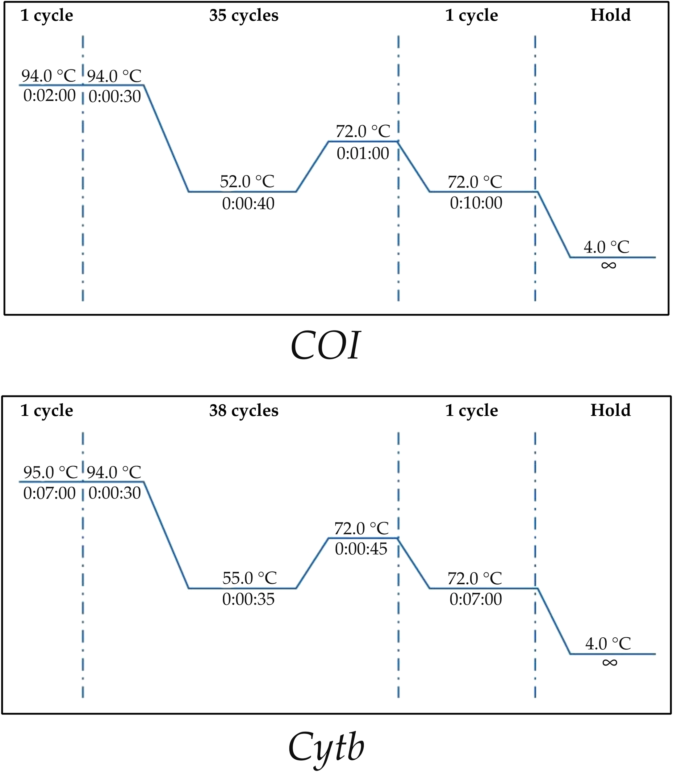 For each sample, 25 mg of muscle tissue were dissected from the dorsal side of the specimen using sterile, disposable plastic forceps, and genomic DNA was extracted using the NucleoSpin® Tissue (Macherey-Nagel) kit according to the manufacturer’s instructions. Each DNA sample was then analyzed using the Nanodrop ND-1000 spectrophotometer (Thermo Fisher Scientific, Waltham, MA, USA) in order to quantify the DNA concentration: measurements of 260/280 nm and 260/230 nm absorbance ratios were used to determine the quality and degree of purity. Finally, genomic DNA was stored at -20 C for subsequent applications. Two mitochondrial gene fragments, COI of about 650 bp and Cytb, of about 700 bp, were amplified using appropriate thermal profiles as shown in Figure 2 and specific primer pairs (VF2_t1 and FishR2_t1 for COI gene from Ivanova et al (2007) and FishcytB-F and CytBI-4R for Cytb gene from Sevilla et al. (2007). All PCR products were visualized through a 0.8% agarose gel and sequenced for both strands with the Sanger dideoxy method by EUROFINS Genomics sequencing services (https://eurofinsgenomics.eu).