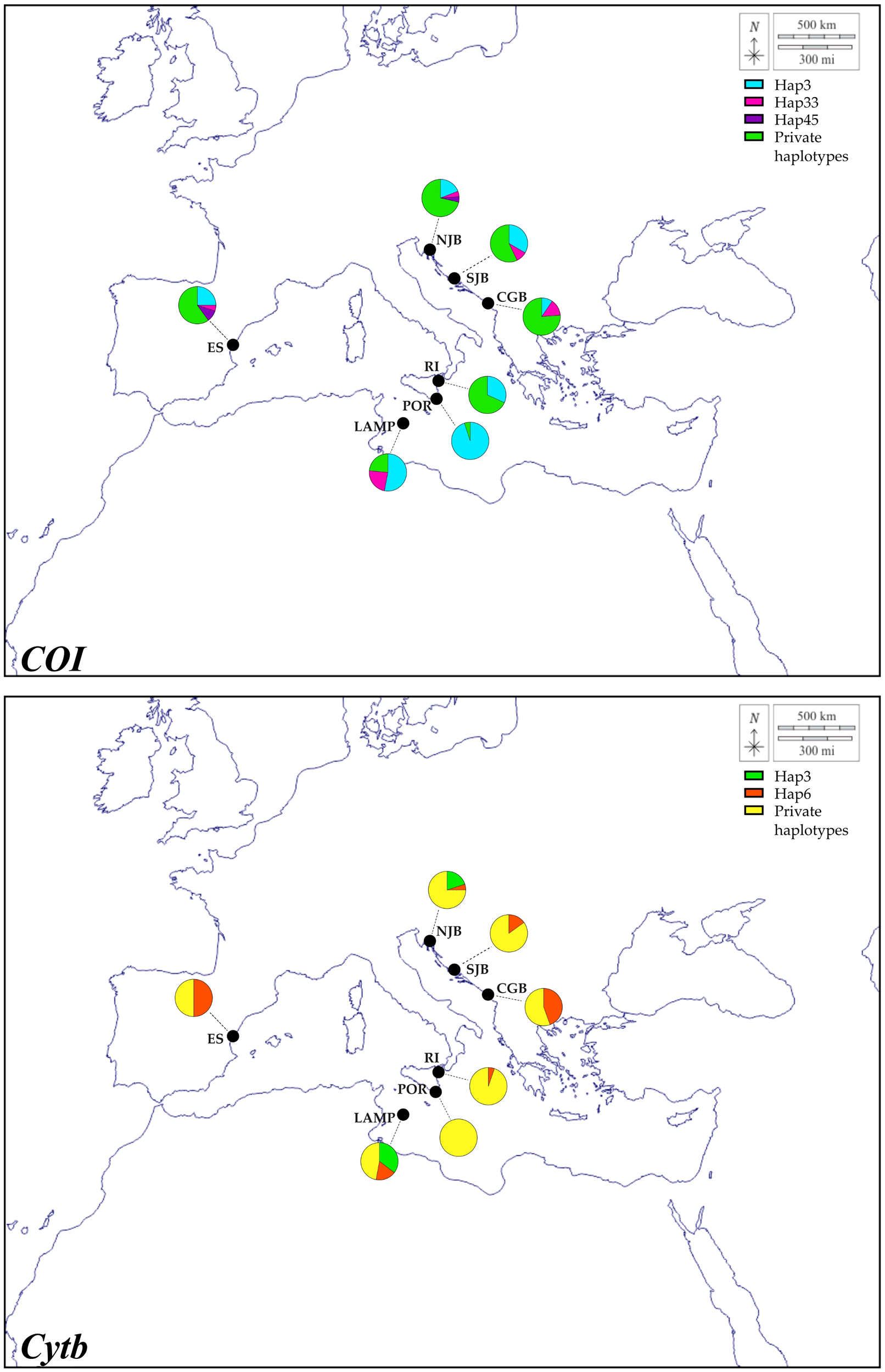 COI and Cytb haplotype datasets were then subject to phylogenetic analyses under both Bayesian Inference (BI) and Maximum Likelihood (ML) criteria to generate two unrooted trees per dataset.