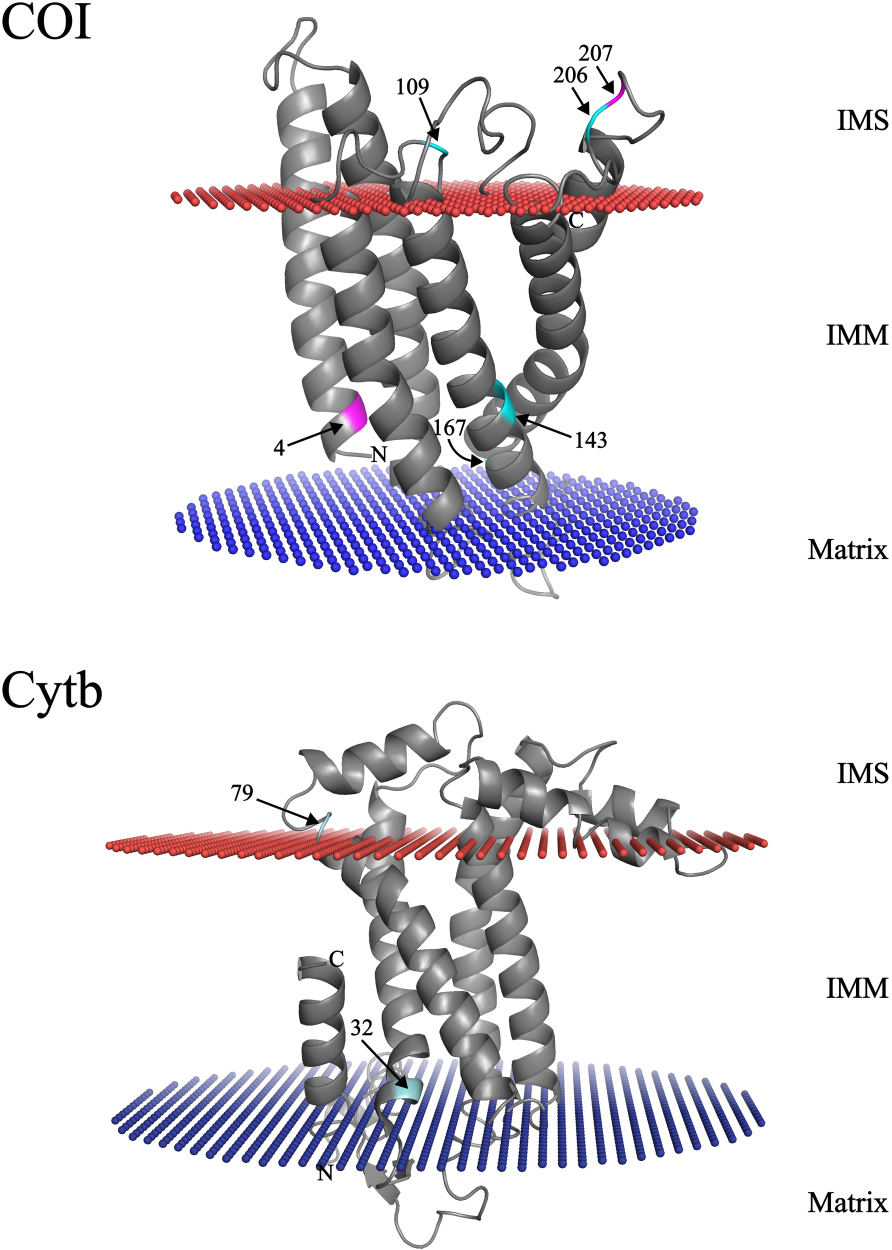 Tridimensional models depicting signs of selection in COI and Cytb proteins from Mullus barbatus. Arrows point at sites identified under different selection levels. Sites highlighted in magenta were retrieved under positive selection, while those colored in cyan are under negative selection. IMM, inner mitochondrial membrane; IMS, intermembrane space.