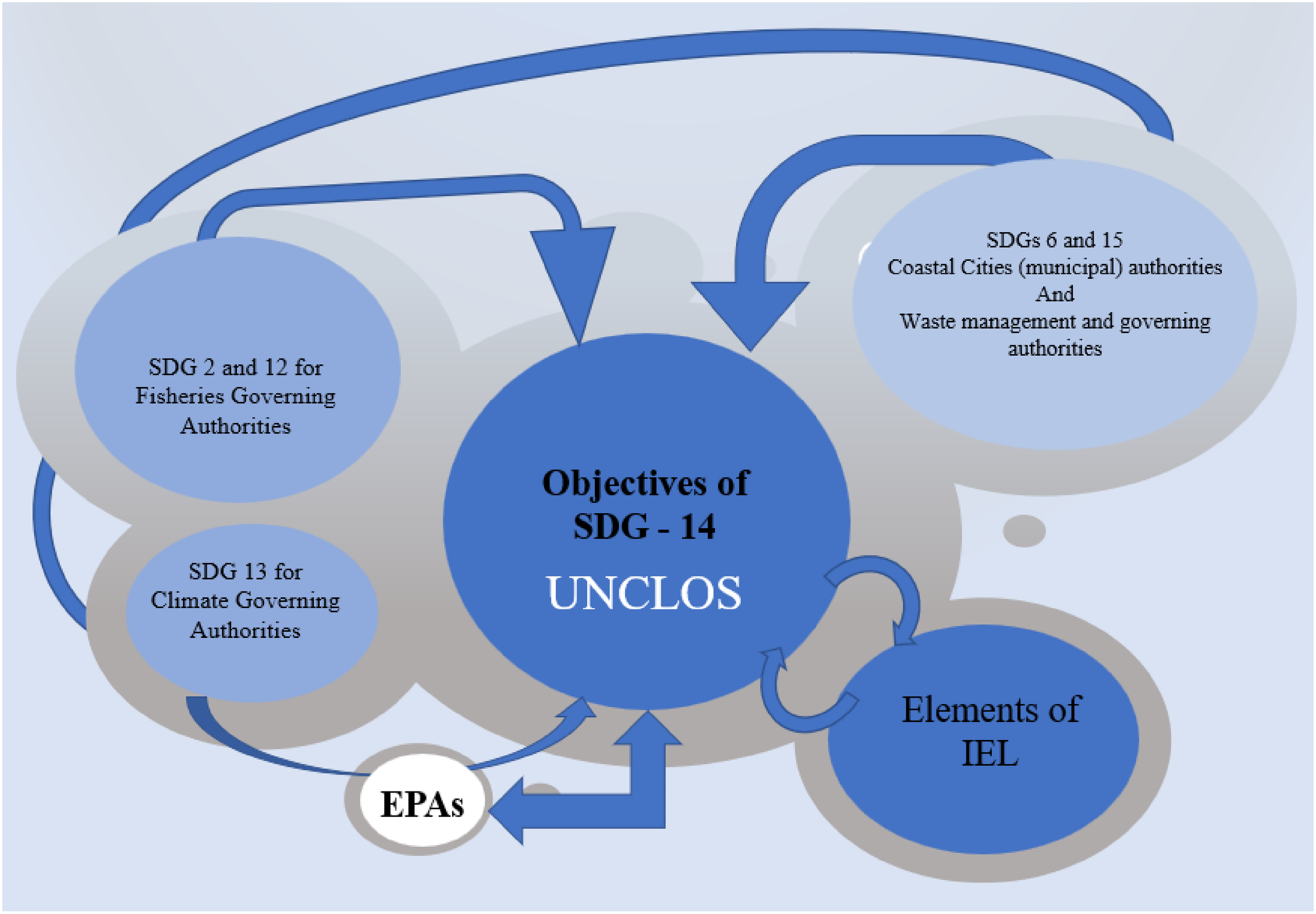 | SDG – 14 | Provisions of UNCLOS | Reviewed IEL | Other SDGs | Involvement of Authorities | Provisions on Bilateralism |