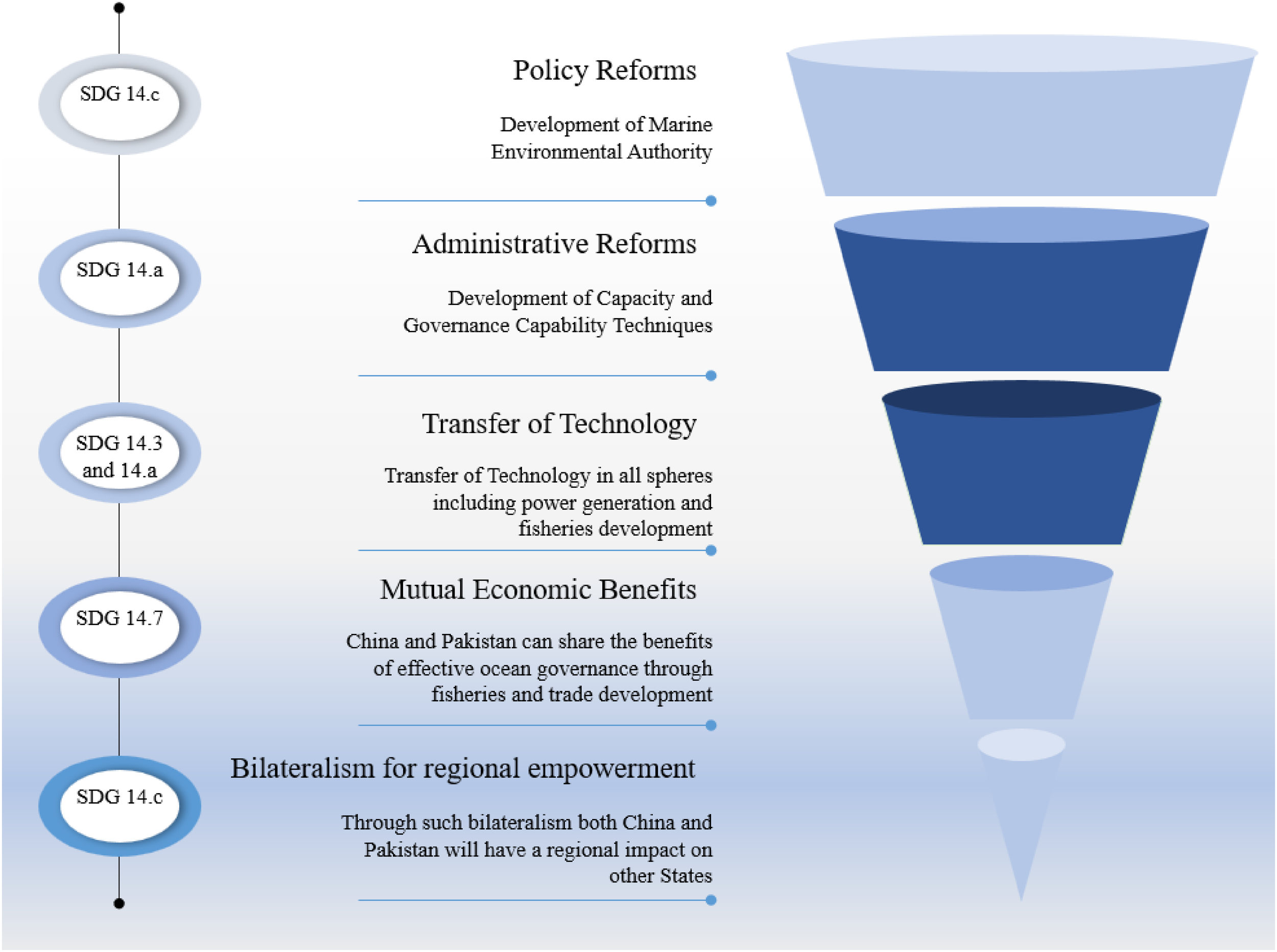 In this section, the existing legal and governance framework and mechanisms of China and Pakistan are analyzed under the above-developed SDG 14 framework. It is already established through the methodology that SDG 14 is a legally binding set of elements, objectives, and governance mechanisms for ocean governance under bilateral arrangements. Therefore, this analysis is conducted to find out the capacity of the existing institutions of China and Pakistan in ocean governance. The discussion below reflects how far both China and Pakistan have established their frameworks for ocean governance and their transformation for bilateral arrangements.