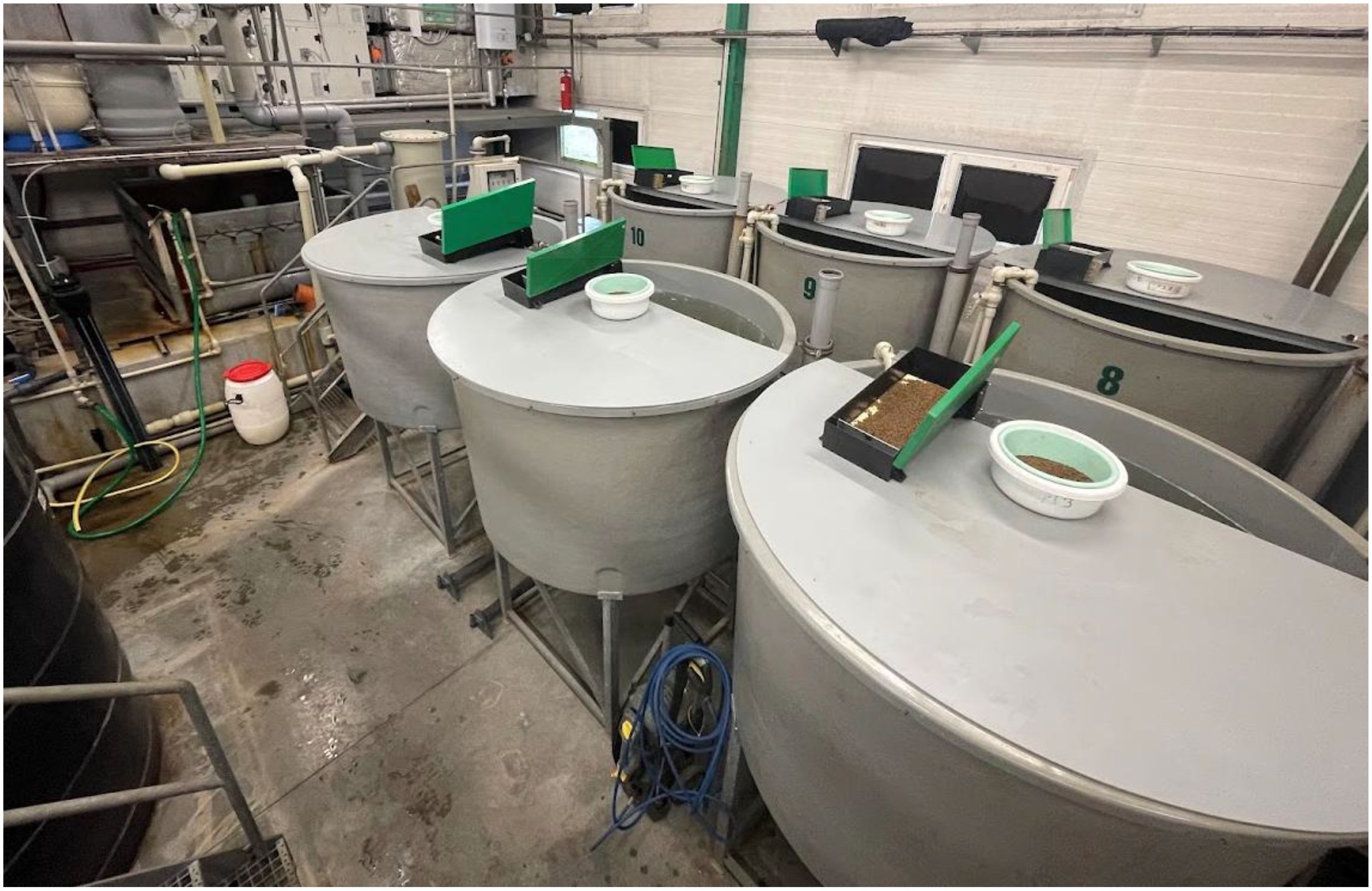 For this study, a semi-experimental RAS comprising 10 cylindrical tanks, each with a volume of 1.5 m³, was used (Figure 1). The bottom outflow of the tank was connected directly to a drum mechanical filter 1-FB (IN-EKO Team, Tišnov, Czech Republic) with a flow rate of 28–000 L.h−1 and to a moving bed biofiltration unit with a volume of 14.6 m³ powered by two air-pumps (Secoh El-S-250; 250 L.min−1, Secoh Ltd., Shanghai). After the sterilisation process using an ozone generator OT 10 model (Ozontech s.r.o., Zlín, Czech Republic) with the dose of 10 g per hour and 6 hour application (Kolářová et al., 2021) and saturation with pure oxygen, water was run from the distribution tank gravitationally back into the rearing tanks. The water flow in the tanks was set at an exchange rate of twice per hour for consistent oxygen saturation and efficient faeces discard.