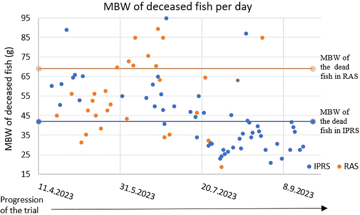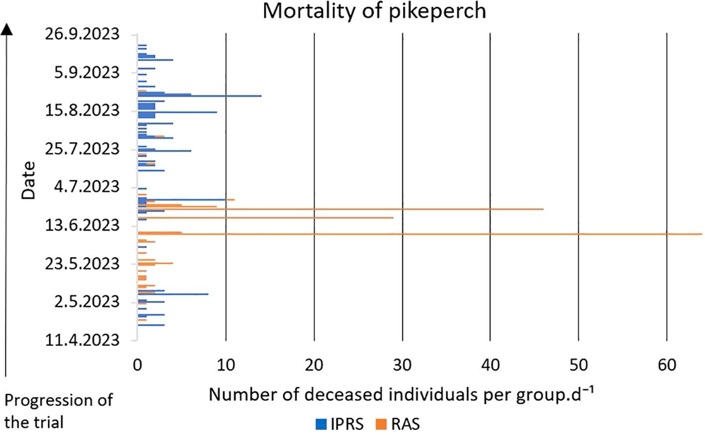 Figure 5. Dynamics of mortality in the experimental IPRS and RAS, episodes of bacterial infection in RAS (8.6., 17.6. and 22.6.) and increase of mortality in IPRS due to the water quality in the pond in late summer and increased heterogeneity among the tank stock.