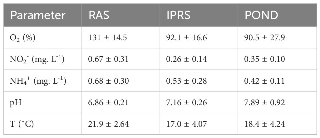 In the RAS and IPRS environments, water temperature and oxygen levels were measured daily at 7:00 using a YSI ProODO oximeter (YSI Inc., Yellow Springs, OH, USA). The pH was measured once a day at 7:00 am using a WTW 3310 pH-metre (WTW, Prague, Czech Republic). Total ammonia and nitrite levels were determined daily at 7:30 am using simple titration and colourimetry reference kits, according to Pěnka et al. (2021). All the previously mentioned abiotic conditions in the ponds were measured thrice a week using the same equipment, and sampling was performed at the same time as in the RAS and IPRS. All water quality parameters in each production system are summarised in Table 1.