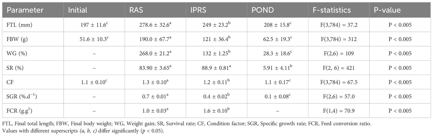 The SR is one of the most important production parameters influencing the feasibility of pikeperch culture. The SRs of fish in the IPRS and RAS were statistically similar (88.9% and 83.9% respectively). However, the mortality of fish in the IPRS differed by the size of the deceased fish and the dynamics of mortality, which mostly occurred in two periods. The first period occurred 2 weeks after acclimation at the beginning of the experiment. During the first period, larger fish with BW of >50 g exhibited mortality, likely because of adaptability issues. During the experiment heterogeneity in the tanks was gradually increasing and resulted in higher mortality in the second part of the experiment, as shown in Figure 5. During the second part (second mortality event) of the experiment, small and malnourished fish weighing <40 g were found dead (Figure 4). The final MBW of all deceased fish found during the experiment was 42.2 g. In a study conducted by Nagy et al. (2022), the SR of IPRS-raised fish was 96%. The observed disparity is likely connected to the larger size of the experimental fish in Hungarian experiment, which naturally have a lower mortality rate and cannibalism is suppressed. In the RAS, the dynamics of mortality were different. During the first half of the experiment, three episodes of bacterial infection occurred, and 76.6% of all the deceased individuals died in these three mortality events before the infection was suppressed. The episodes of bacterial infection did not differ between the sizes of the experimental fish and resulted in a higher MBW in the RAS group (68 g). Because the experiment was designed to evaluate the pros and cons of each production system and the overall mortality in all the three mortality events combined did not reach 10% of all stocked fish, the experiment was continued. As stated by Yanong (2012), the risk of a rapid disease outbreak in the RAS represents a major drawback of keeping fish in the RAS. The SR in the present study is, therefore, lower than those of other studies focusing on juvenile pikeperch rearing or early grow-out (Nyina-Wamwiza et al., 2005; Pěnka et al., 2023, 2021; Rónyai and Csengeri, 2008). Nevertheless, the experiment presented in this study was conducted on a larger scale than the other mentioned studies and is, therefore more comparable with commercial production in intensive farms, where elimination of bacterial diseases is more complicated. SRs for both the IPRS and RAS were in accordance with those of Fontaine et al. (1995), suggesting the SRs of Eurasian perch (Perca fluviatilis) in the RAS of up to 90%–100% and 70%–80% in cage culture during the growing season in a lake. The disparity in the SRs between cages and modern the IPRS units was likely caused by improvements in water circulation and quality between cages and modern IPRS. The SR of pikeperch in the pond was significantly lower, at only 5.9% ± 4.11%, and varied between ponds. Such a low SR probably occurred for the following reasons. The ponds used in the experiments were highly turbid during the second part of the experiment (late summer) and contained excessive amounts of algae. Although the measured oxygen levels did not decrease to <60%, morning oxygen deficiencies were common. Nevertheless no dead fish were found during the morning oxygen deficiencies. As previously stated, all fish stocked in the experiment originated from RAS. These demanding adaptations likely negatively affected their survival. The last factor to be considered is fish predators. This issue likely affected other members of the polyculture stocking as well. The survival rates of carp (70.3%) and tench (71.8%) were lower than the normall SRs of a second year carp and broodstock of tench in ponds (75% and 90%, respectively) as calculated and published by Hartman and Regenda (2016). Because the survival rate of pikeperch juveniles in ponds was the lowest, the POND group is presented as an unfortunate example of the unpredictability of pikeperch production in ponds. Although 80%–88% of all farmed fish in the Czech Republic are produced through pond aquaculture (Vavrečka et al., 2019), the outcome of pond rearing is unpredictable and may sometimes be unsuccessful. This is particularly true for sensitive, high-oxygen-demanding predatory species such as the pikeperch. Herein, most of the pond’s production capacity was used by fish species other than pikeperch. The growth of common carp was particularly intensive.