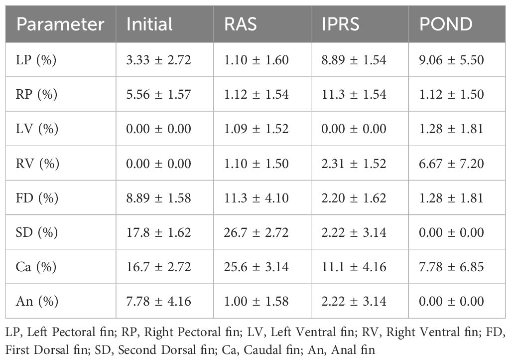 During the assessment of fin erosion, only categories 0 (no damage) and 1 (minor damage) were observed. Categories 2,3 and 4 were not found on inspected individuals indicating that the fish suffered from only minor fin erosion. From the 90 assessed individuals in each group, 68.9% ± 12.86% in the RAS, 40.0% ± 7.2% in the IPRS and 27.2% ± 16.5% in the POND group were affected by the fin erosion in category 1. Fish from the RAS group mostly experienced erosion (category 1) of the caudal fin (25.6% ± 3.1%), first dorsal fin (11.3% ± 4.10%) and second dorsal fin (26.7% ± 2.72%). Fish from the IPRS mostly suffered from the erosion of both pectoral fins (8.89% ± 1.54% left; 11.3% ± 1.54% right) and caudal fins (11.1% ± 4.16%). Fish from the POND group exhibited uneven erosion across all fins, with the highest frequency of erosion (category 1) found on the caudal fin (7.8% ± 6.85%), left pectoral fin (9.06% ± 5.50%) and right ventral fin (6.67% ± 7.20%). A detailed description of the erosion of all fins is presented in Table 3.