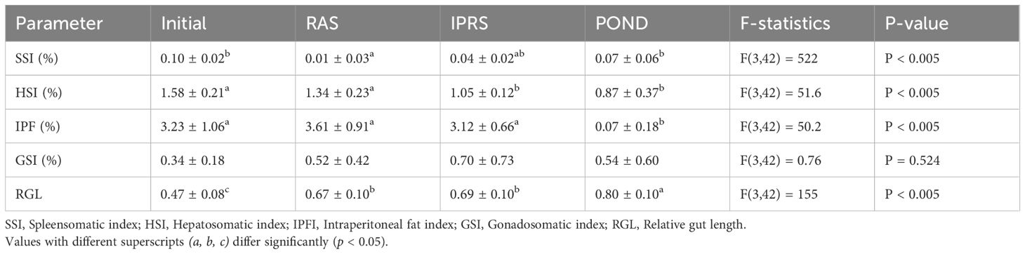 Table 4. Somatic indexes of experimental pikeperch from different production systems after 24 weeks of rearing.