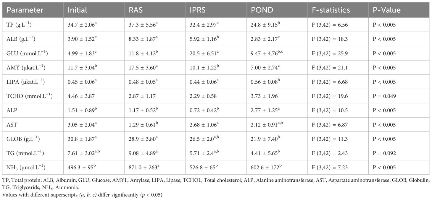The plasma levels of TP, ALB, GLOB, NH3 and LIPA were within the ranges normally found in pikeperch in good conditions (Kolářová and Velíšek, 2012). TP was statistically higher in fish from the RAS and IPRS compared with that from the POND group. The concentration of ALB differed significantly among all the tested groups, with the highest levels in the RAS and the lowest in the POND group. GLOB was statistically higher in the RAS compared with the POND group. GLU was statistically the highest in the IPRS and exceeded the values normally determined in pikeperch under good conditions. AMY showed statistically significant differences among all the groups, being the highest in the RAS and the lowest in the POND group. Fish from POND were the only ones not exceeding the normal values of AMY for pikeperch in good conditions. TCHO did not show any statistically significant differences among the groups. LIP was significantly the highest in the POND group. NH3 was the highest in the RAS but did not exceed the normal values for pikeperch. TG levels in pikeperch across all the groups, including the fish at the start of the test, were higher than the reported normal values for pikeperch. Among the groups, the TGs were statistically lower in the POND group, which only slightly exceeded the values for pikeperch in good conditions. Increased activity of the liver enzyme ALP was higher in fish from the POND group, with ALP levels in the POND group being two times higher than those in the upper range of pikeperch in good conditions. Pikeperch from the IPRS had the highest AST values compared with those from the POND group and RAS. All biochemical parameters are listed in Table 5.