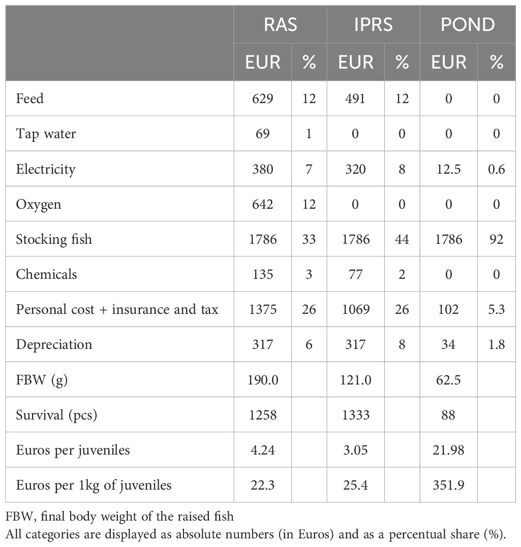 To calculate production costs for pikeperch juveniles, the following cost categories were evaluated: feed, electricity, tap water, oxygen, personnel (including insurance and tax), stocking material, chemicals and depreciation costs. The final production cost was compared with the final number of produced fish to calculate the exact production cost per fish. Personal cost was calculated on the basis of the time spent working with each system. In case of three tanks in RAS it was on average 60 minutes per day. In case of IPRS it was 45 minutes per day. In case of the POND price of personell was calculated to cover the personal cost during the harvest, sorting the fish after harvest and occasional work like cleaning the ouflow and inflow of the ponds during growing season. To estimate the production cost of pikeperch in a polyculture system, personal labor, electricity, and depreciation expenses were evenly allocated among the cultured fish species (common carp, pikeperch, rudd, and tench broodstock), with each group assigned 25% of the total operational costs, excluding those related to stocking material. Although pikeperch accounted for only 2.38% of the total harvested biomass at the termination of the experiment, this imbalance was offset by its disproportionately higher share at the beginning of the production cycle, when pikeperch represented 42.3% of the total stocked biomass due to the more complex and demanding nature of its stocking process.All the time spend on data collection, sampling, calculating of uneaten feed etc was not included as it does not reflect a standard production practices and it would artificially increase production cost of the fish in this study