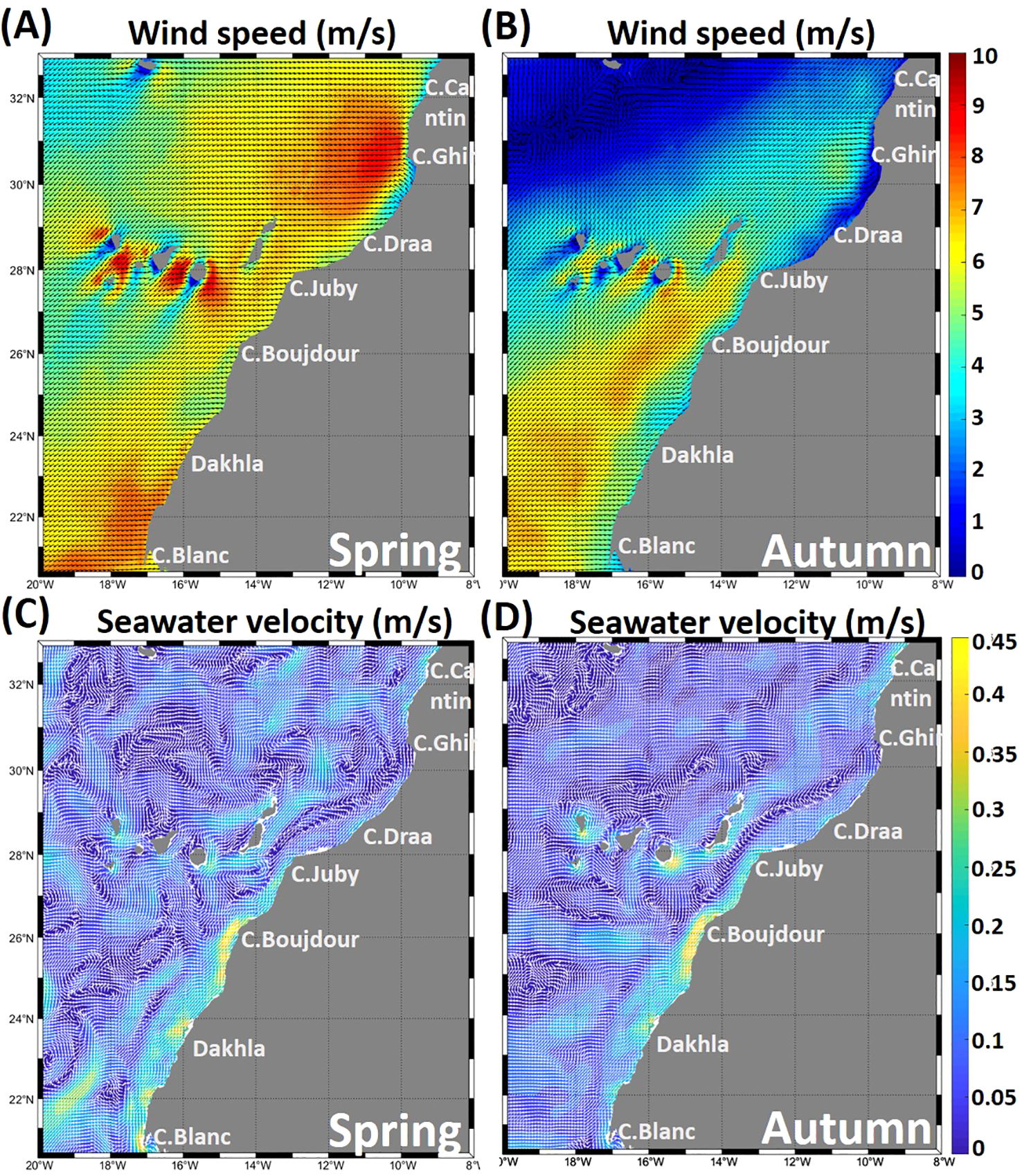 The NW African region is constantly subject to north-easterly winds (parallel to the coast) with latitudinal fluctuations, the intensity of which varies with the seasons. Wind speeds reach maximum values of over 8 m/s in spring (Figure 3A), particularly in the area between Cape Cantin and Cape Juby (6°from the coast to offshore), as well as in the region between Dakhla and Cape Blanc (1-2°from the coast to offshore). In autumn (Figure 3B), wind speeds are lower in the north, between Cape Cantin and Cape Juby, with relatively moderate intensity in the Cape Ghir region, around 5 m/s. The area between Cape Juby and Cape Blanc is subject to moderate winds of around 6.5 m/s. The northern zone is subject to seasonal winds, while the southern zone is characterized by a higher wind intensity, particularly in spring.