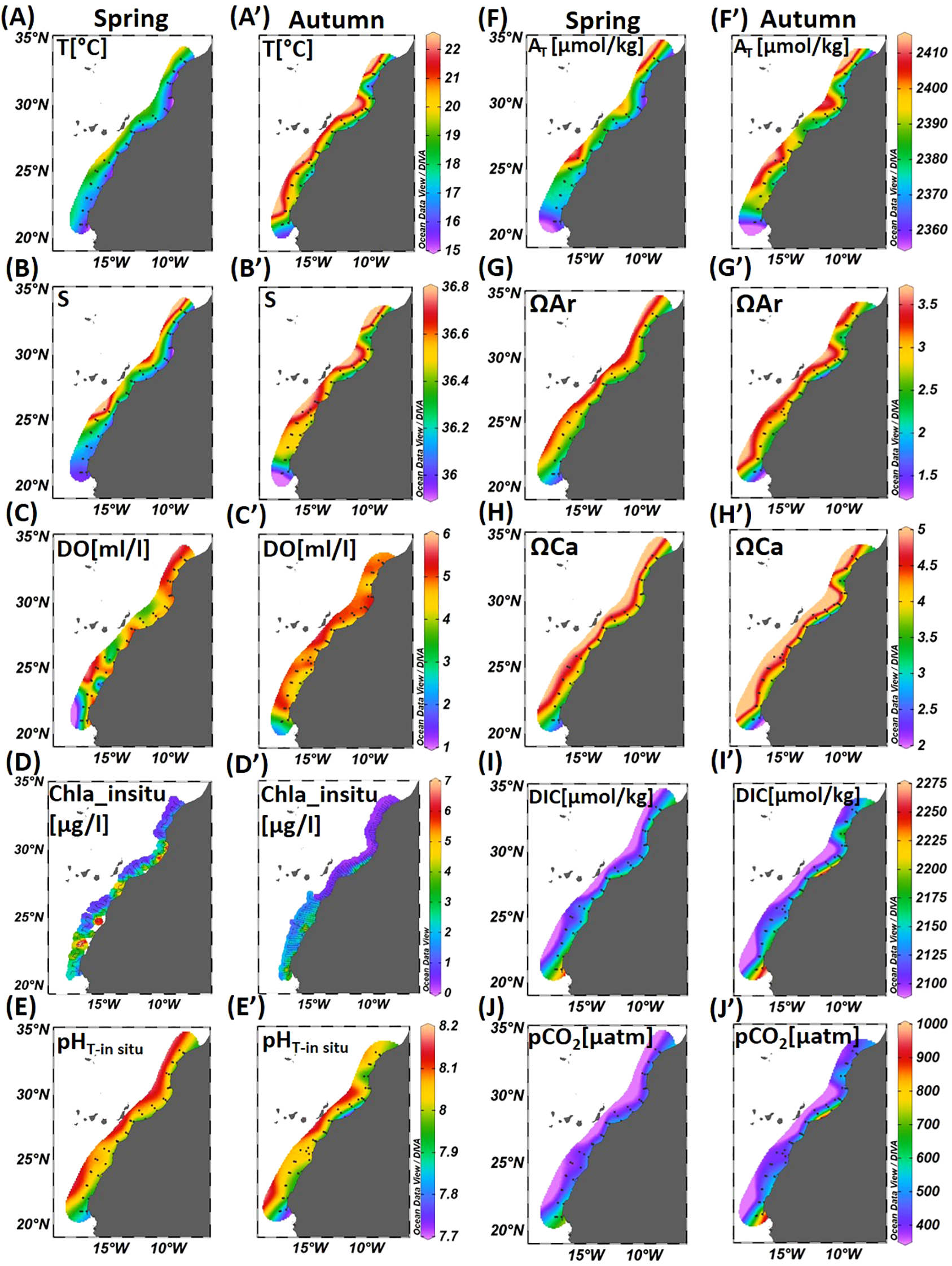 Surface distribution of: (A, A’) Temperature (T, °C); (B, B’) Salinity (S); (C, C’) Dissolved Oxygen (DO, ml/l); (D, D’)In-situ Chlorophyll a (Chla_in situ, µg/l); (E, E’)in-situ pH (pHT-in situ); (F, F’) Total Alkalinity (AT, µmol/kg); (G, G’) Aragonite saturation state (ΩAr); (H, H’) Calcite saturation state (ΩCa); (I, I’) Dissolved Inorganic Carbon (DIC, µmol/kg); and (J, J’) Partial Pressure of CO2 (pCO2, µatm) in spring and autumn seasons.