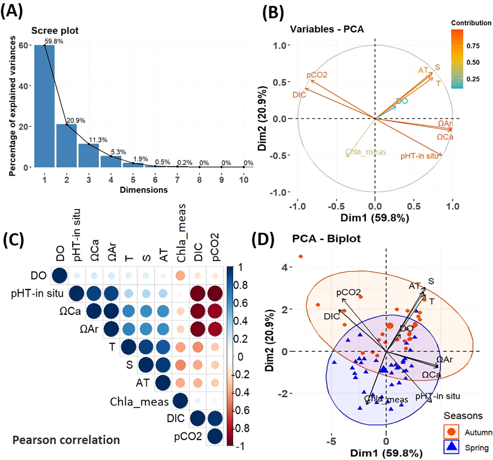 Principal Component Analysis (PCA) of environmental parameters collected at the surface (5m). PCA scree plot (A), PCA Variables (B), Pearson Correlation (C). Positive and negative correlations are displayed in blue and red, respectively, while the size and intensity of the circles in the matrix are proportional to the correlation coefficient between the variables. PCA Biplot of the Principal Component Analysis (PCA) by season (D). The groups of stations corresponding to different seasons are highlighted by ellipses of the same color (spring blue and autumn in red).