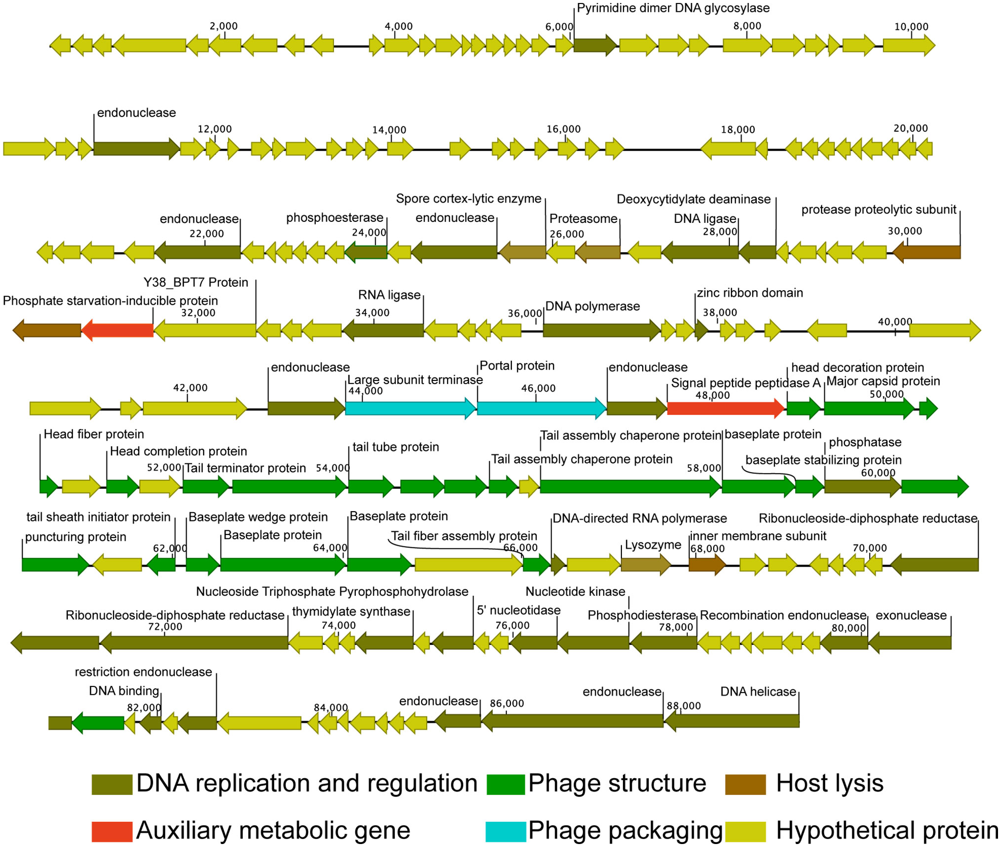Genome map of Pseudomonas phage vB_PaeM_M1. Putative functional categories were defined according to annotation and are represented by different colors. The length of each arrow represents the length of each gene.
