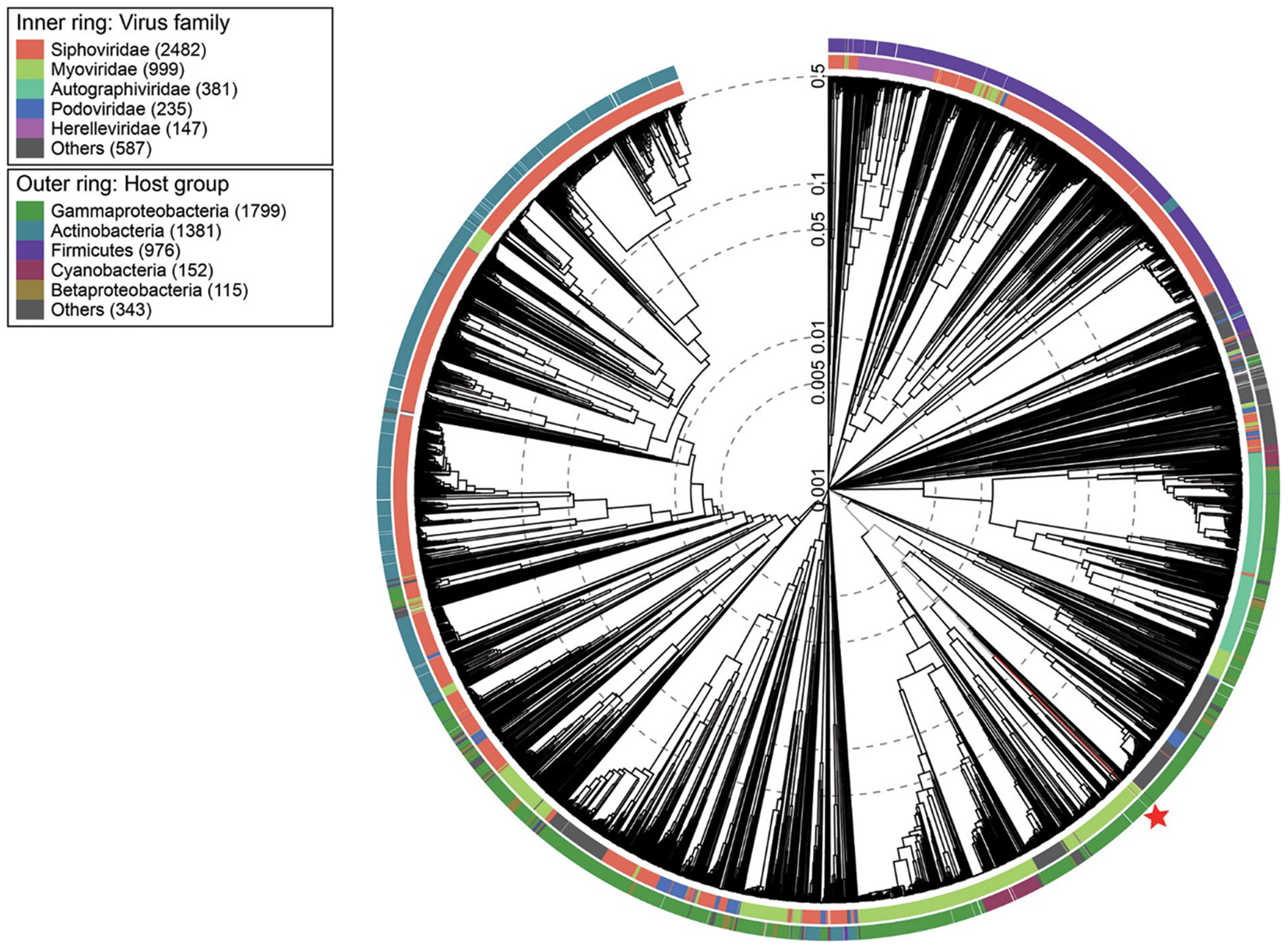 Viral phylogenetic tree of whole phage vB_PaeM_M1 genomes represented in the circular view. The colored rings represent the host groups (outer ring) and virus families (inner ring). These trees are calculated by BIONJ according to the genome distance matrix and take the midpoint as the root.
