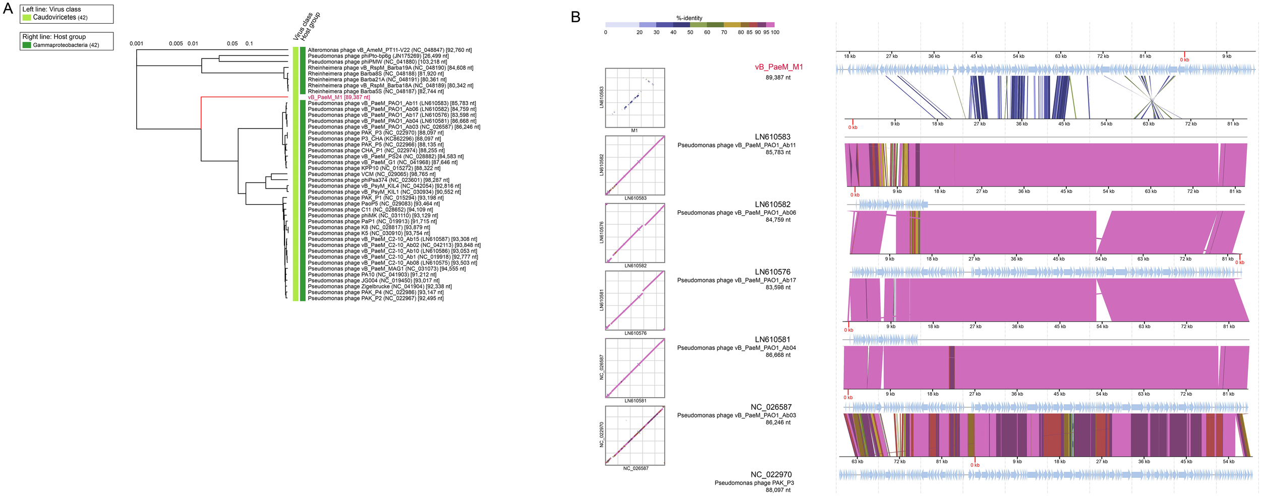 Phylogenetic and comparative genomic analyses of Pseudomonas phage vB_PaeM_M1. (A) Phylogenetic tree of Pseudomonas phage vB_PaeM_M1 and the 36 closest virus genomes. (B) Genomic comparisons between Pseudomonas phage vB_PaeM_M1 and vB_PaeM_M1-like viruses. The shading below each genome indicates sequence similarities between the genomes, with different colors representing the levels of similarity.