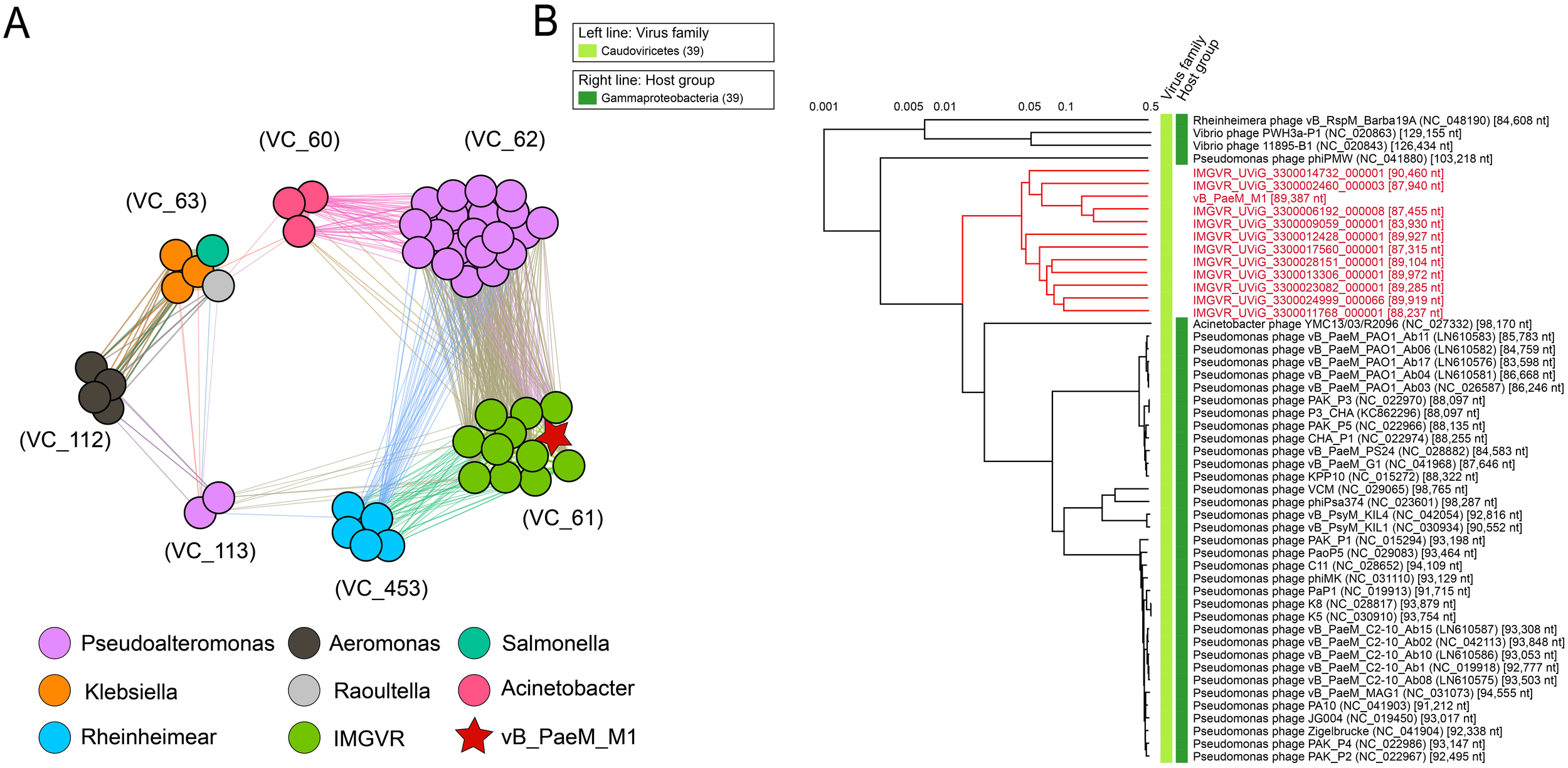 (A) vB_PaeM_M1, virus from NCBI RefSeq database, and related environmental viral sequences from Integrated Microbial Genomes/Virus (IMG/VR). Different colors of nodes represent different kinds of viruses. Edges represent similarity scores between genomes. VCs are generated by vcontact2, and the network is visualized by gephi version 0.9.2. (B) Whole-genome-based phylogenetic tree constructed by vB_PaeM_M1, metagenomic assembled uncultured viral genomes (UViGs) and isolated viruses. The members in VC_61 are shown in red.