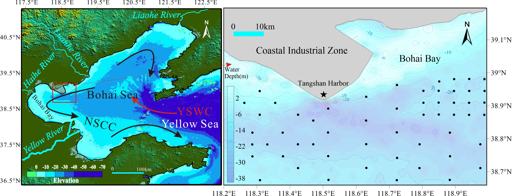 Bohai Bay (BHB) is a semi-enclosed body of water situated on the western periphery of the Bohai Sea. Over recent decades, neighboring cities such as Beijing, Tianjin, and Tangshan had witnessed accelerated economic growth (Tong et al., 2014). This rapid expansion had led to an intensification and diversification of human activities, which in turn had significantly influenced nutrient conditions. While earlier studies predominantly focused on terrestrial factors like sewage treatment, fertilizer use, and water management (Jiang et al., 2005; Ning et al., 2010), it had been observed that nutrient concentrations in waters closer to the shore, especially near the estuary, were consistently higher than those in offshore areas (Wu et al., 2021).