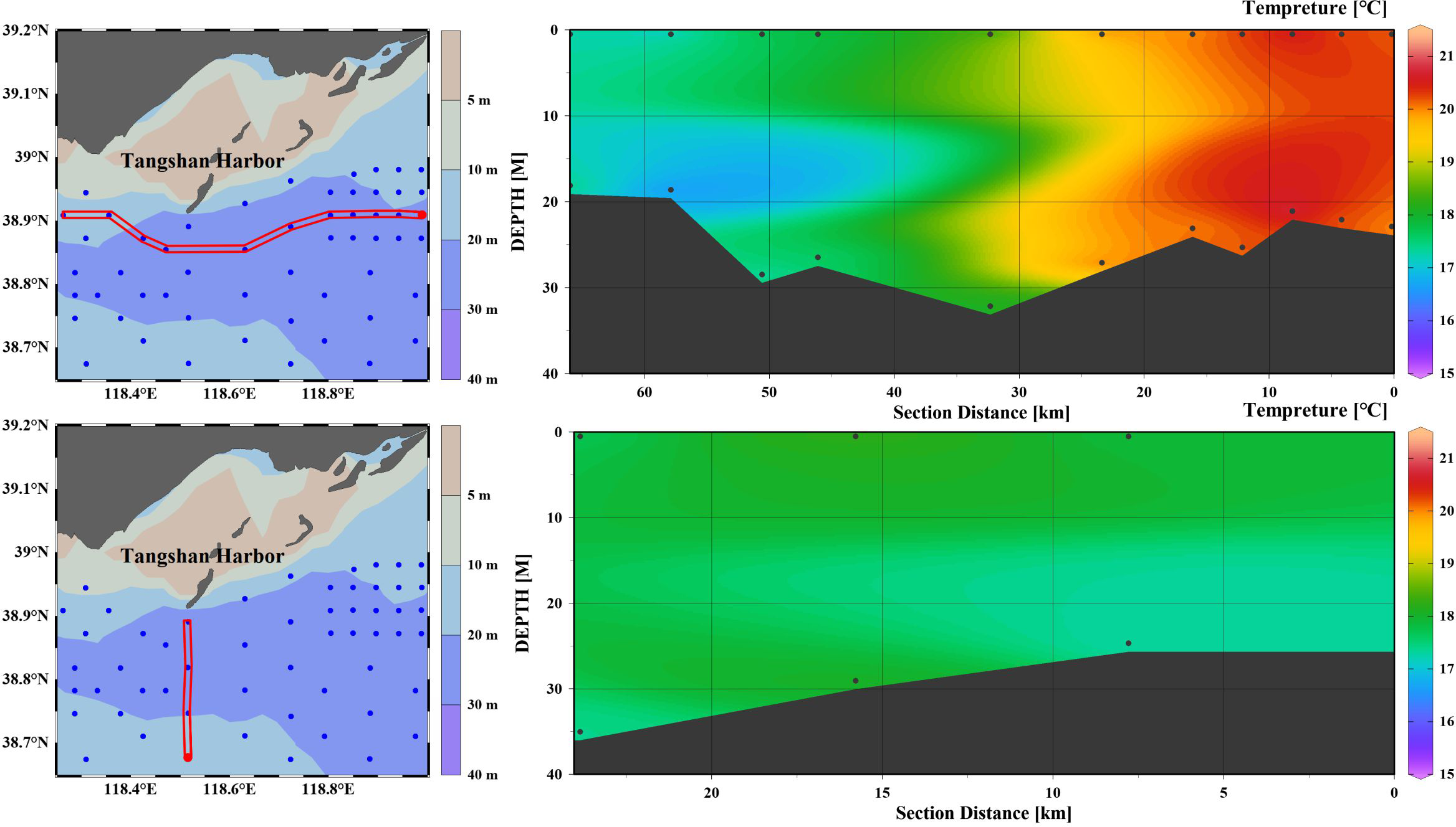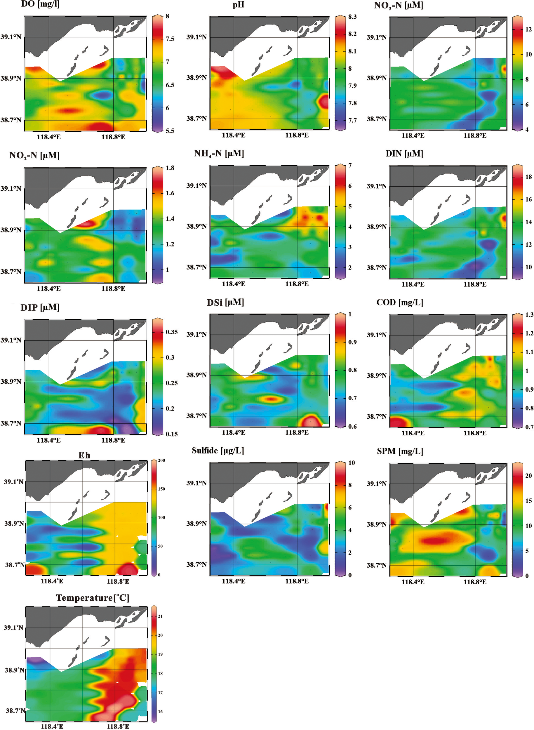 Recent studies in BHB revealed that higher concentrations of Dissolved Inorganic Phosphate (DIP) and Dissolved Silicate (DSi) were more common in offshore waters than in nearshore waters (Wang et al., 2009; Li G. J., et al, 2012). This suggested that sediment release or exchange from other marine regions might have a significant impact, which merited further investigation through additional field observations. We hypothesize that the gradual increase in in-situ seawater temperature will lead to consistent alterations in the chemical composition of the marine environment. To investigate the current state of temperature-sensitive temperate coastal ecosystems, this study conducted a cruise survey in the autumn, measuring the physical and chemical parameters of seawater at 55 stations. The research objectives include: 1. Investigating the influence of temperature on the in situ marine chemical field, with a focus on parameters related to eutrophication such as oxidation-reduction potential (Eh), DO, pH, nitrate nitrogen (NO3-N), DIP, and DSi. 2. Predicting the response of coastal marine environmental indicators, including Chemical Oxygen Demand (COD), and sulfide.