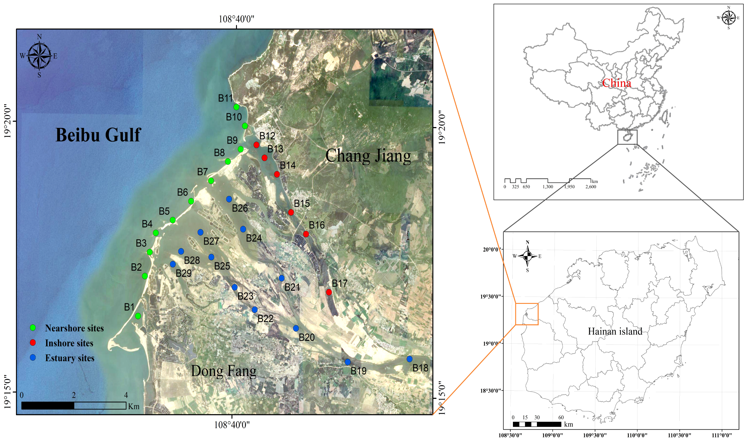 In July 2023, the project team collected surface sediment samples from 29 sites. All sampling locations were georeferenced using a Global Positioning System (GPS) receiver, and samples were collected from estuaries, bays, and nearshore areas to represent the entire estuarine region. At each sampling site, surface sediments (0–10 cm) were collected from three positions at 3-meter intervals. The procedures for sample collection, storage, and transportation of samples were carried out in strict accordance with the requirements of the code. All samples were kept clean during the sample collection, transportation, and storage.