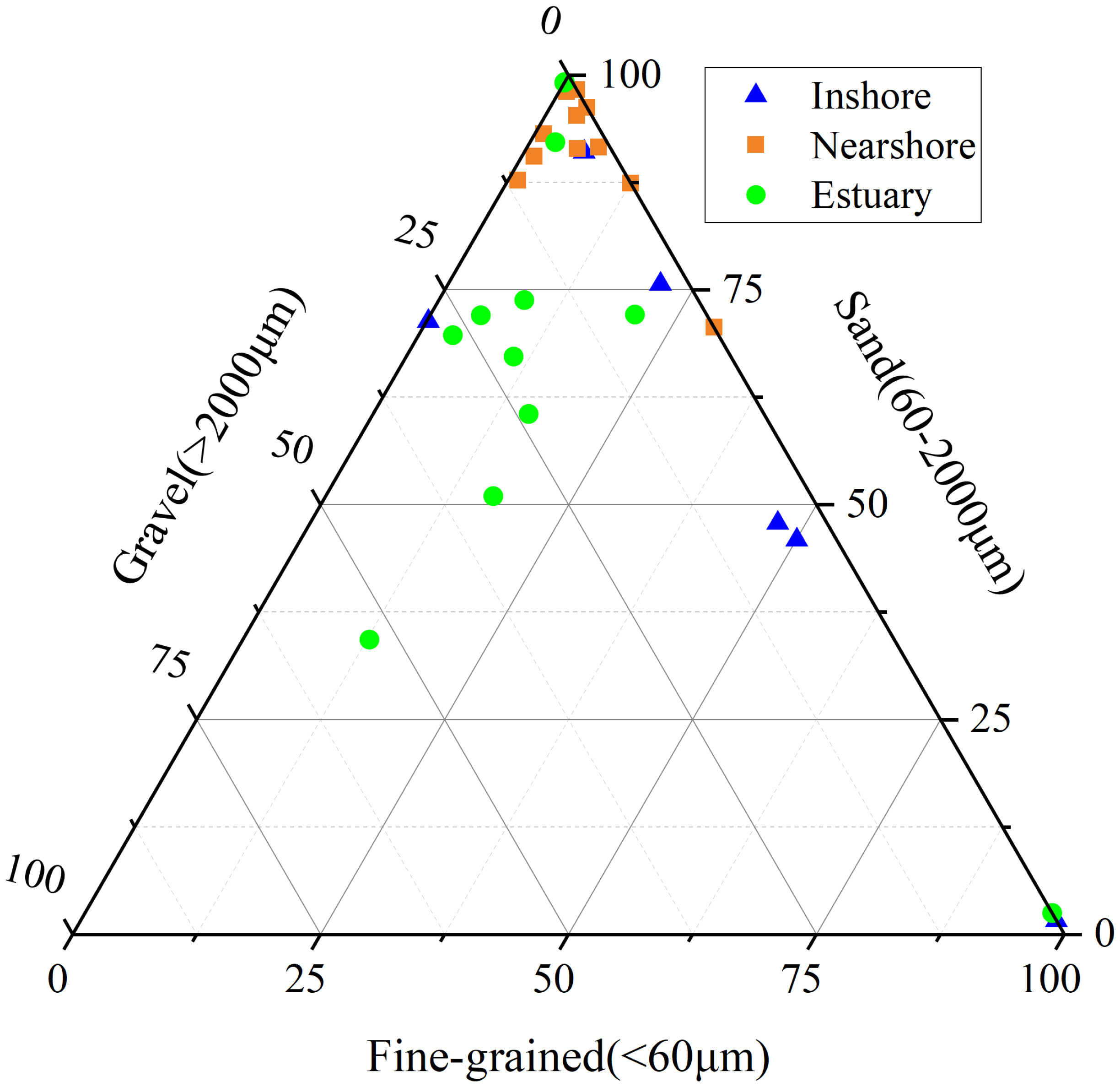 The influence of sediment grain size on metallic concentrations is multifaceted. The ternary diagram in Figure 2 illustrates the distribution of sediment particle sizes. The data reveals that the surface sedimentary deposits are predominantly fine-grained and sandy in composition. Fine-grained sediments possess a larger specific surface area and a greater adsorption capacity, which typically leads to the immobilization of more metallic elements, thereby reducing their bioavailability and mobility (Wang et al., 2013; Chen et al., 2016; Zhou et al., 2020). In contrast, coarse-grained sediments often lead to the migration and bioaccumulation of metallic elements. Studies indicate that nearshore sediments are predominantly composed of sand, accounting for 70.64 - 98.26% of the total sediment composition, while fine-grained sediments contribute only 0.8 - 29.36%. Fine-grained sediments in the nearshore inner shelf of the study area are influenced by fluvial inputs, tidal forces, and wave energy, which collectively regulate sediment transport and the spatial distribution of metals. (Wentworth, 1922; Syvitski et al., 2005; Xiao et al., 2016; Wu et al., 2024, 2025). However, in estuarine and inshore areas, fine-grained sediments can reach maximum proportions of 98.39% and 97.52%, respectively. Notably, gravel is more prevalent in estuarine and inner bay regions, with a proportion up to 52.91%.